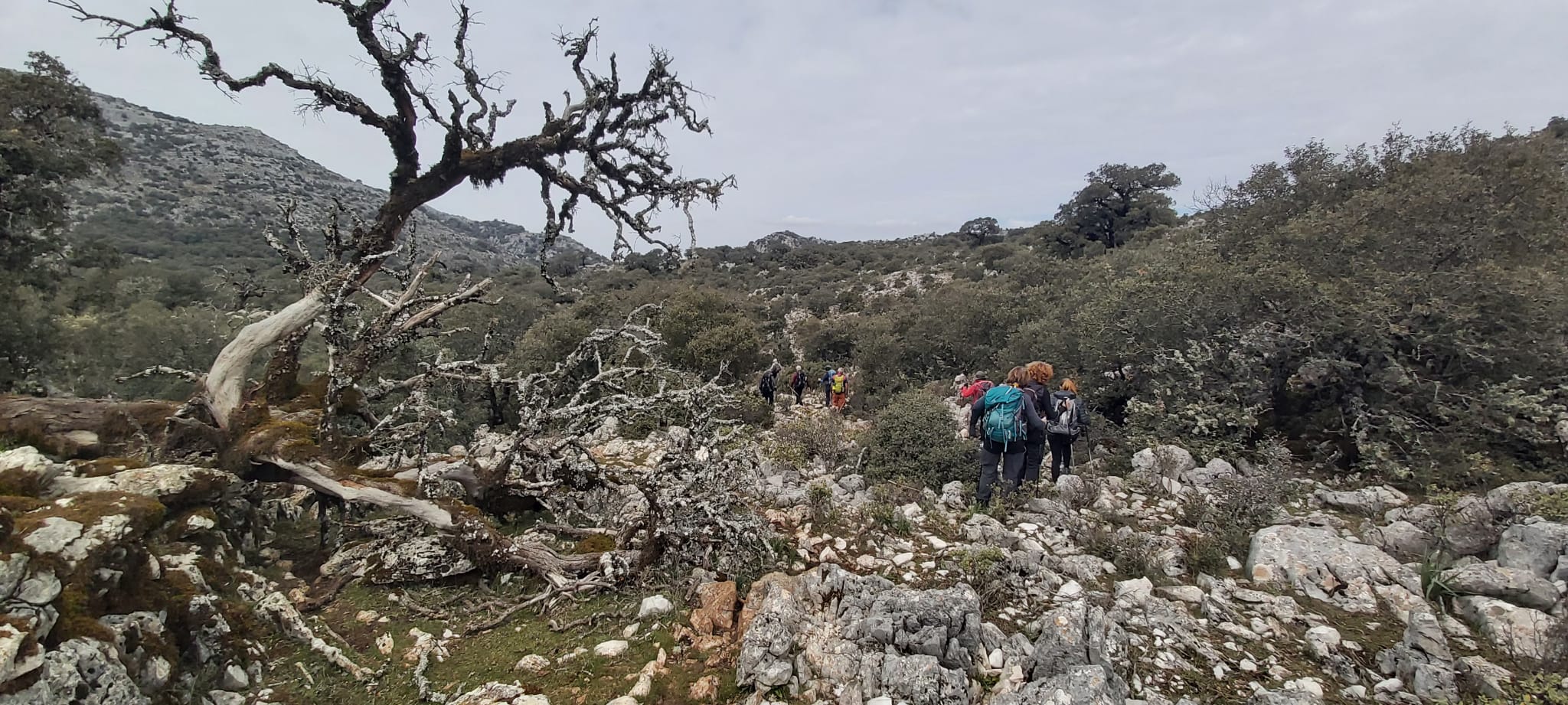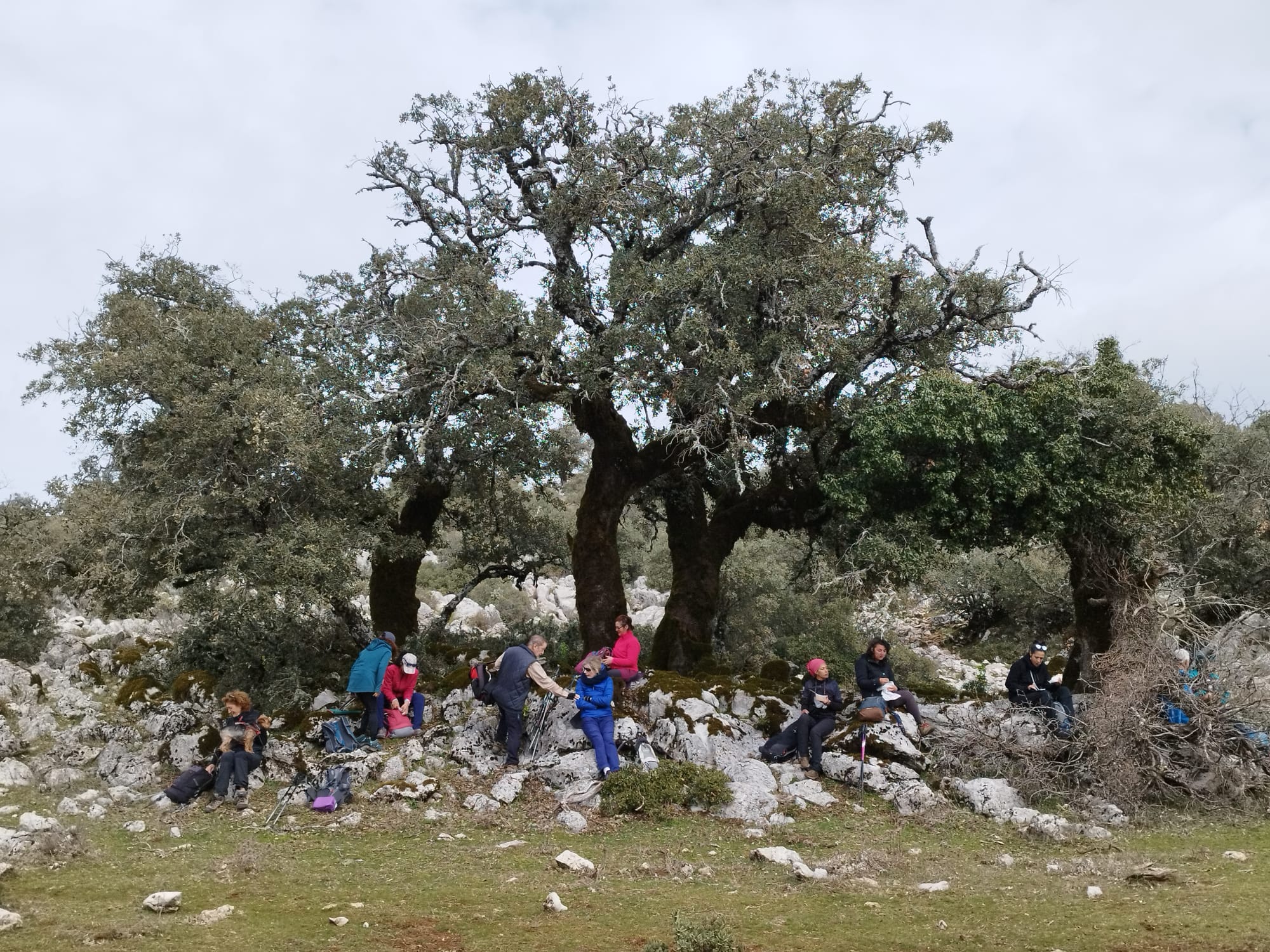 Salimos del Torcal y nos adentramos en una zona de bosque de impresionantes encinas y Quejigos, paraje precioso donde paramos a comer. Hemos recorrido casi 7 kilómetros.