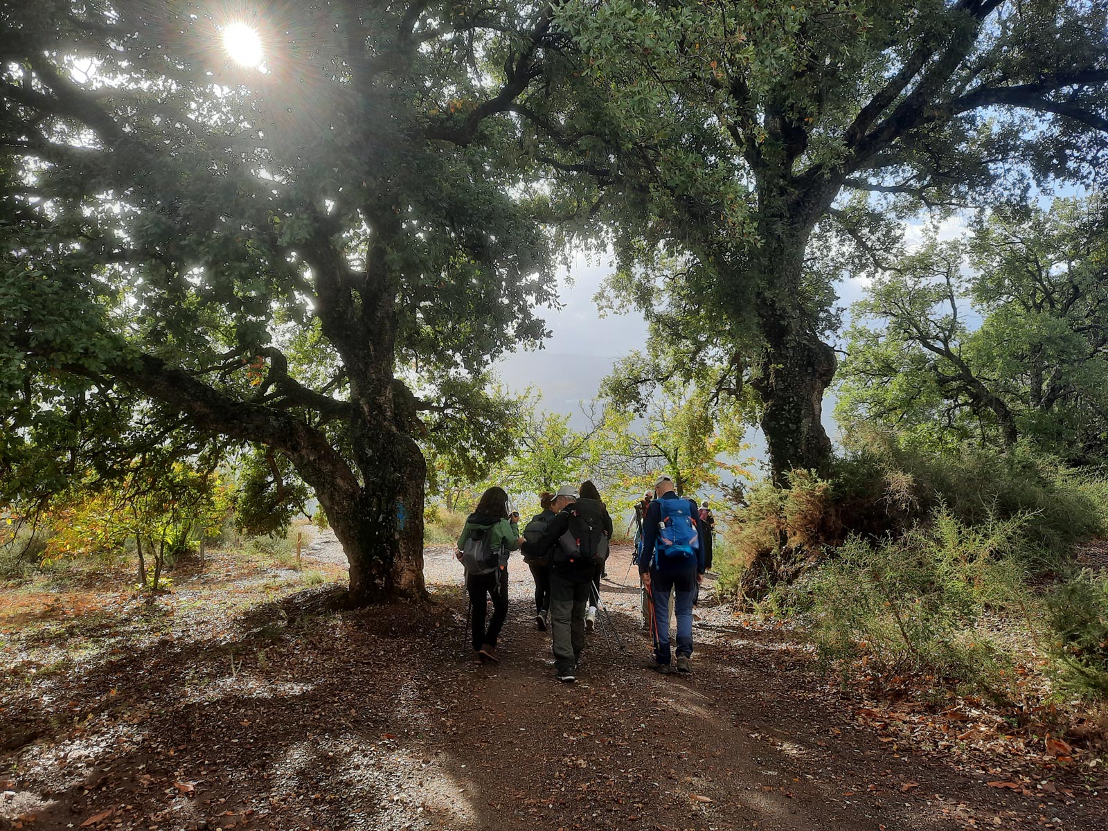 Seguidamente iniciamos la marcha atravesando el centro del pueblo, pasando por la Iglesia de Cartajima y el Ayuntamiento, para enlazar en sentido descendente con el Camino del Helechar, señalizado como Sendero PR-A 224 (Cartajima-Pujerra). En el primer kilómetro pasamos junto a un Área Recreativa, que dejamos a nuestra izquierda, y casi sin darnos cuenta pronto nos sumergimos en un precioso castañar que discurre entre fuertes desniveles, y salpicado a veces por encinas, cerezos, madroños, quejigos centenarios, alcornoques y olivos.