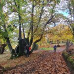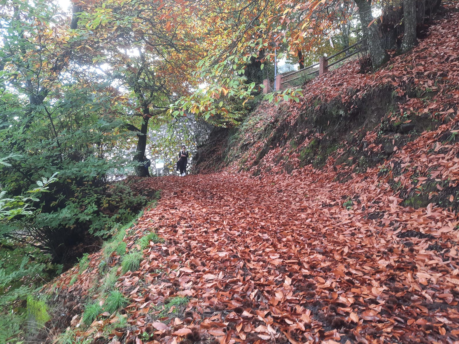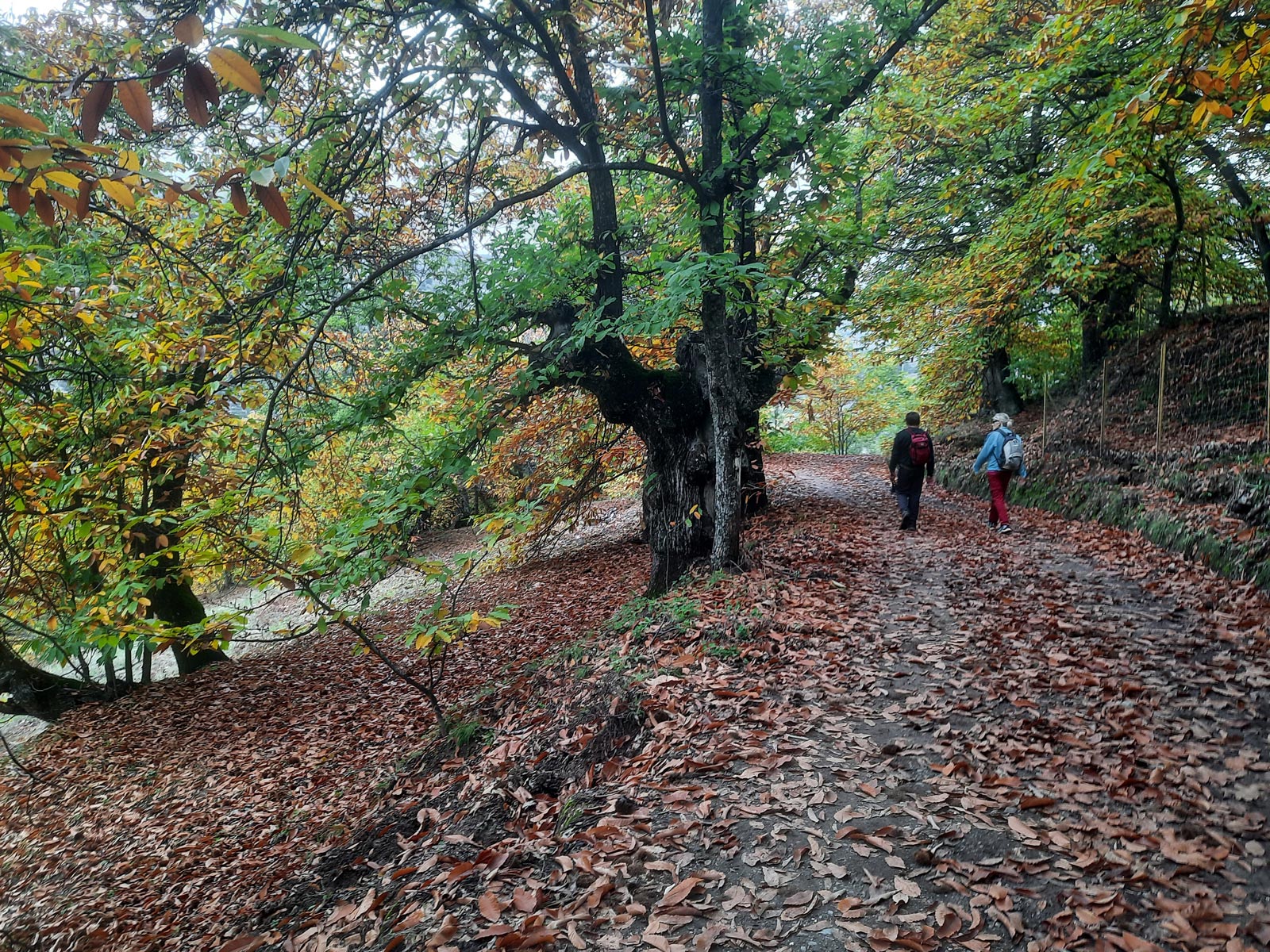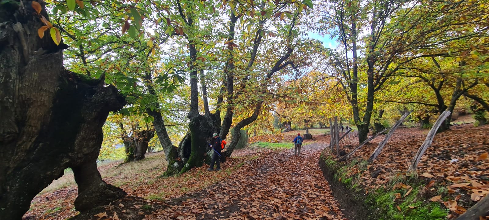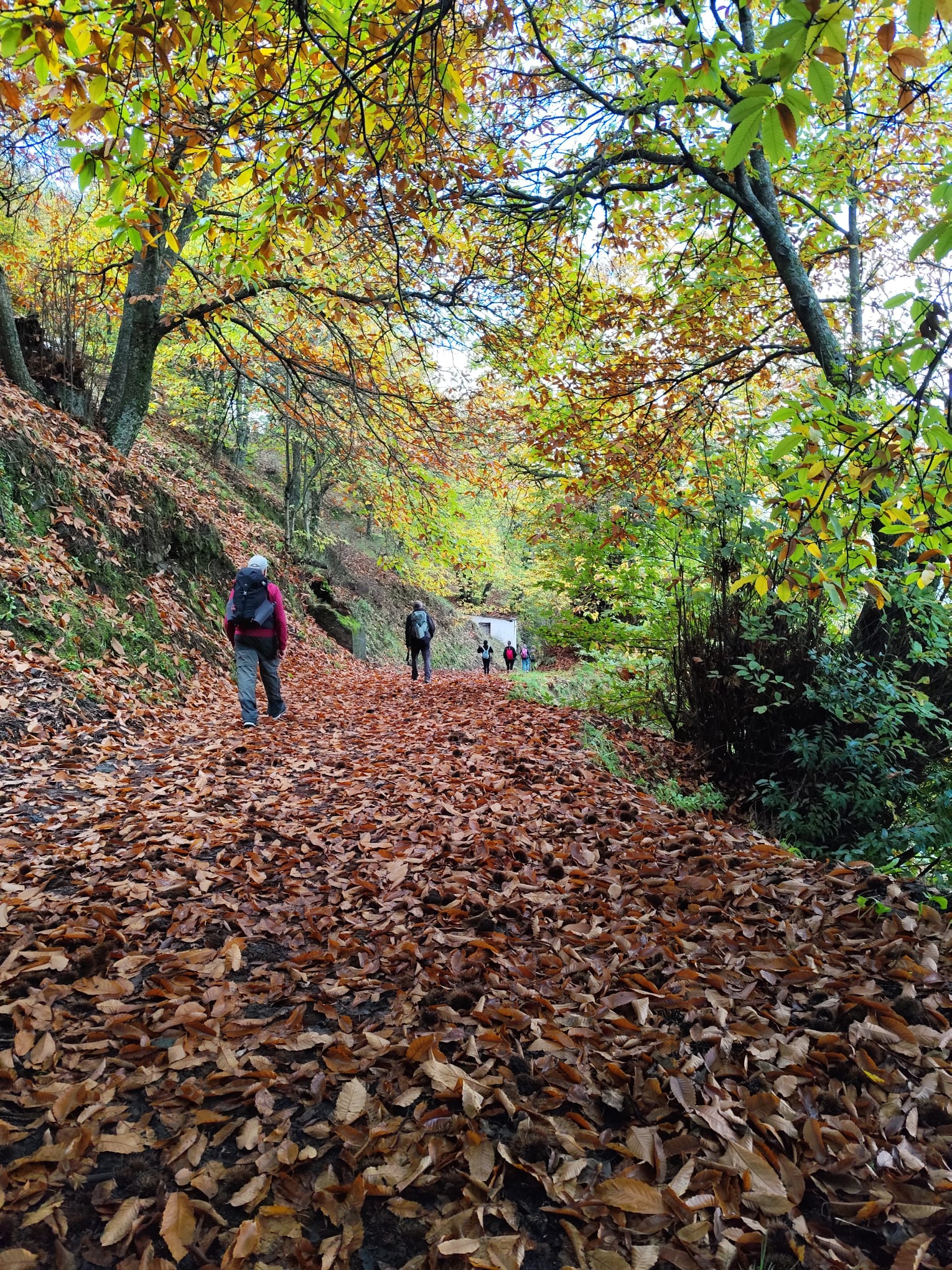 Los castaños, ya casi desnudos, filtran la poca luz solar que tenemos hoy, creando un “mágico bosque” inmerso en un bello efecto cromático, fruto de la mezcla de los distintos colores que lucen las pocas hojas que aún les quedan, juntamente con el crujir de las hojas secas a nuestro paso y la alta humedad ambiental.