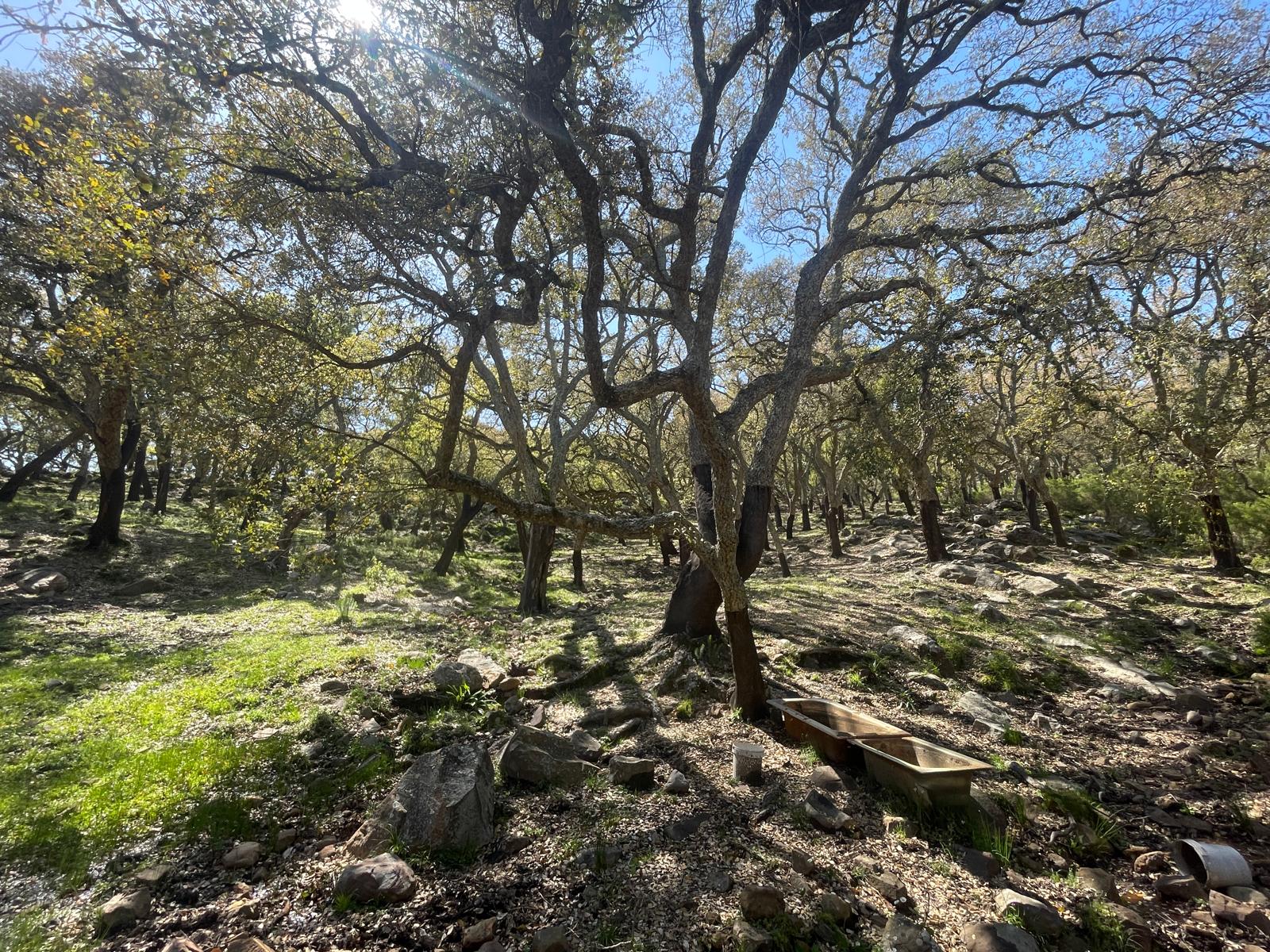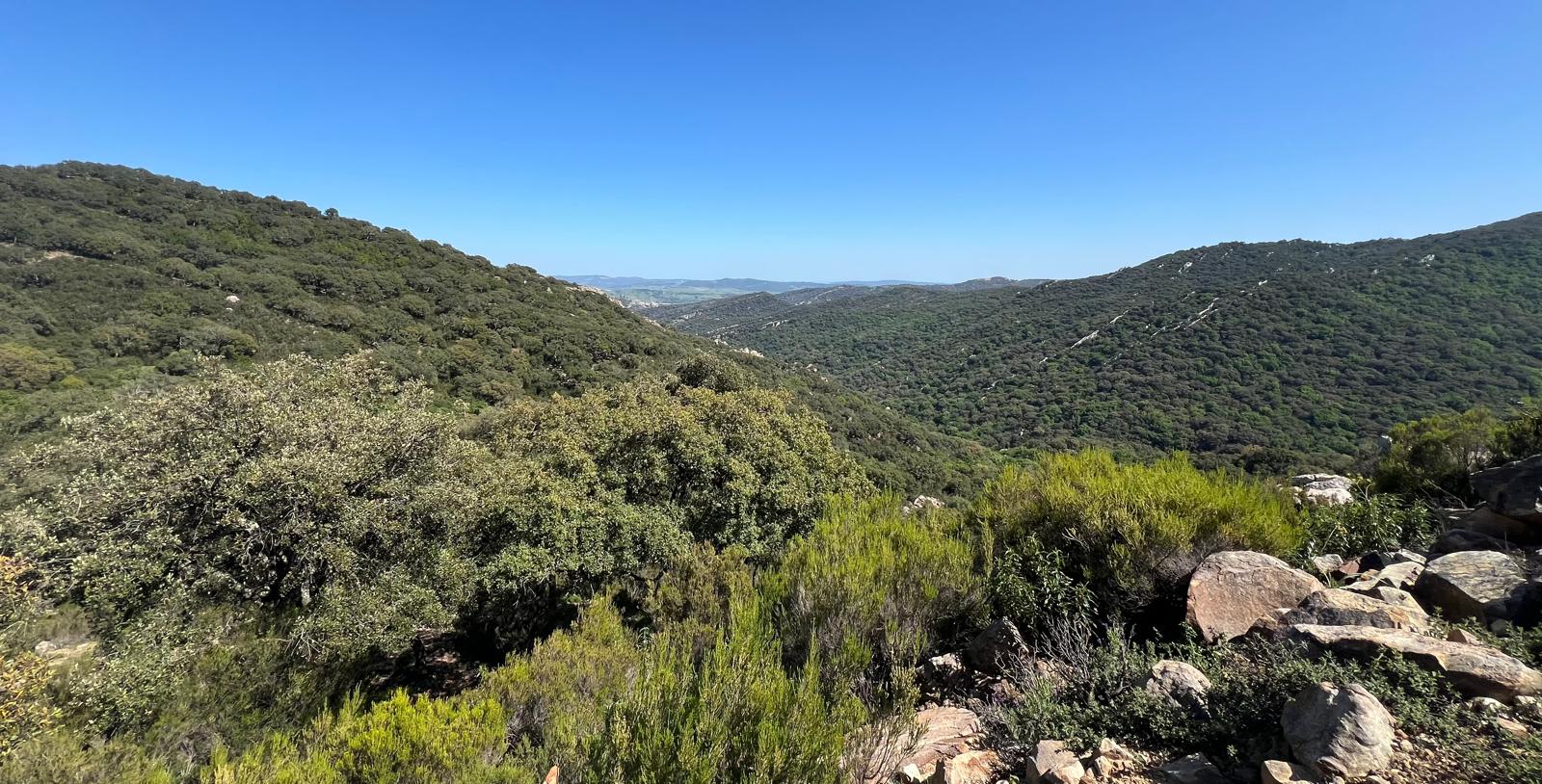 Atrás quedaron los malos momentos que tuvimos que afrontar en el camino de subida, que no obstante aportaron un puntito de aventura a la excursión. Ahora descendemos cómodamente por las cuencas del arroyo Jateadero y del Gamero, cruzando inicialmente un alcornocal, para continuar después por un bosque de acebuches, encinas, algarrobos y madroños, que vienen a desembocar en una llanura de eucaliptos, a falta de cubrir los tres últimos kilómetros de ruta.