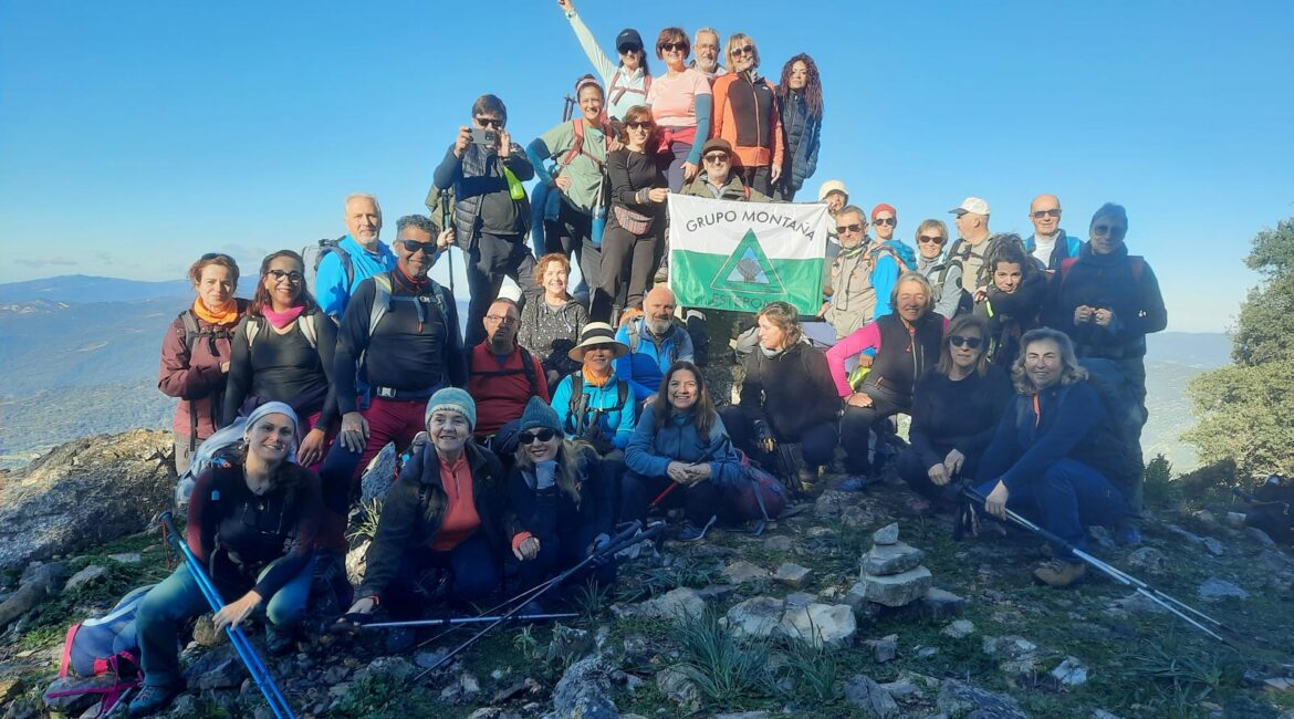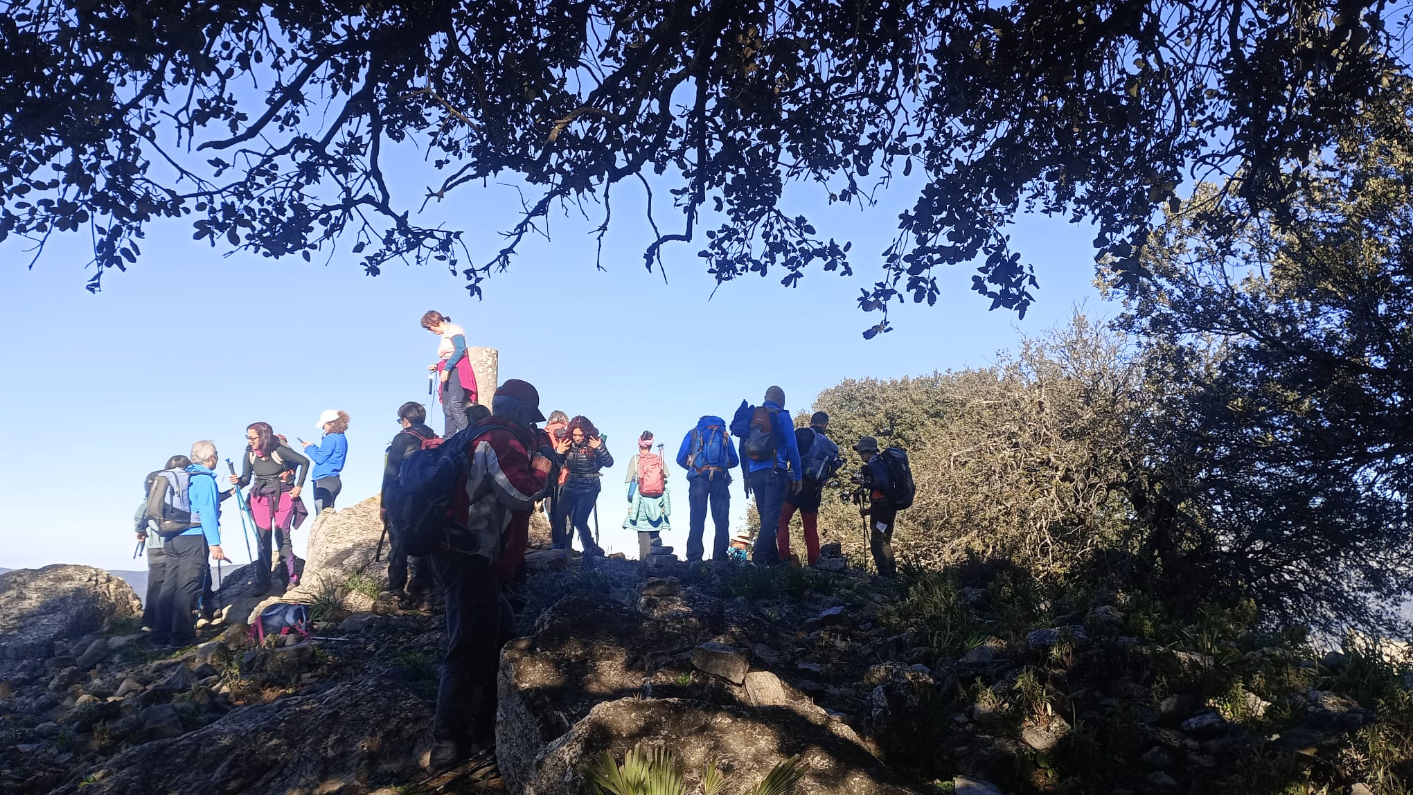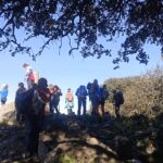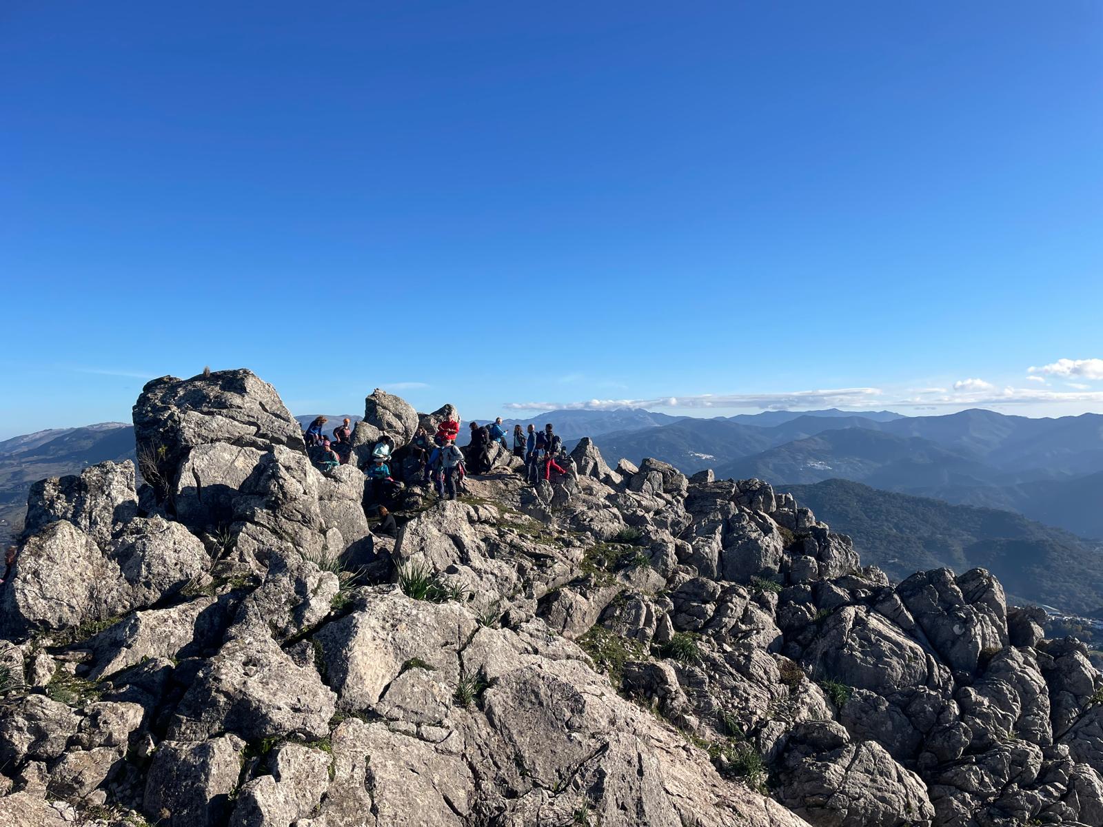 Reanudamos la marcha cresteando hacia el cercano Pico del Hacho de Gaucin, a escasos 300 metros desde donde nos encontramos, cuyo Vértice Geodésico nos indica que estamos a 1.011 metros sobre el nivel del mar. Emblemático lugar para la típica fotografía de grupo alrededor de dicho vértice, con bellas panorámicas muy admiradas y fotografiadas desde todos los ángulos, y que van desde el Mar Mediterráneo y la costa africana en lontananza, hasta los pequeños pueblos serranos que nos rodean de los Valles del Guadiaro y del Genal, Jimena de la Frontera y San Pablo de Buceite con la Sierra del Aljibe al fondo, enmarcados en las sierras colindantes.