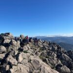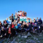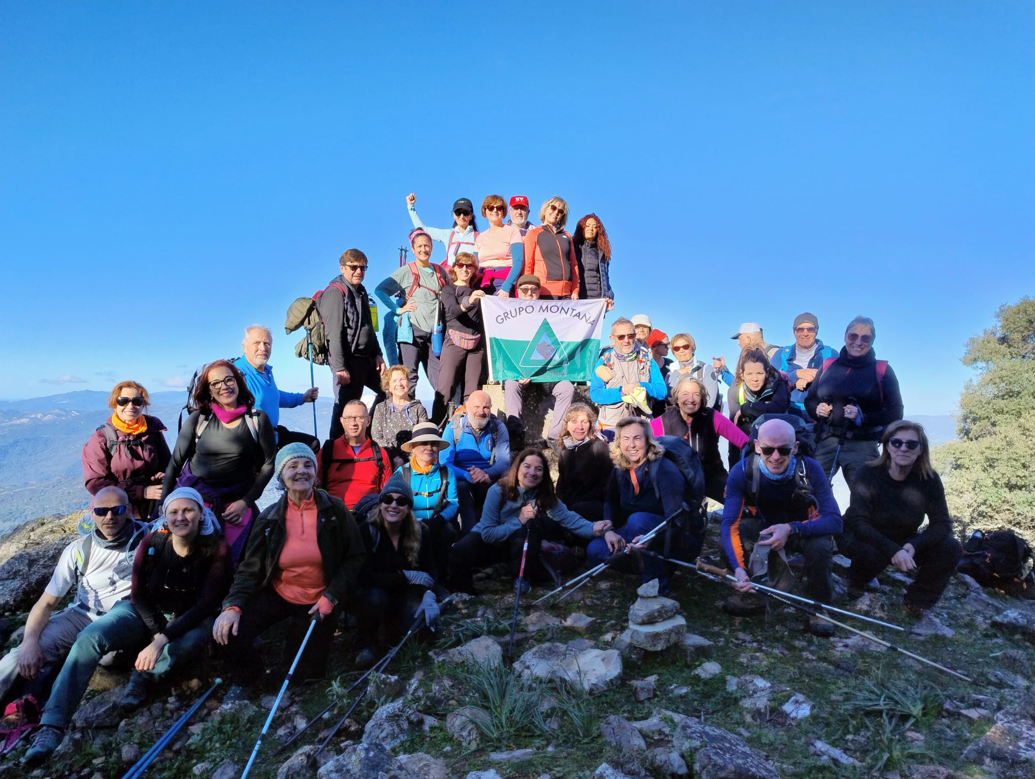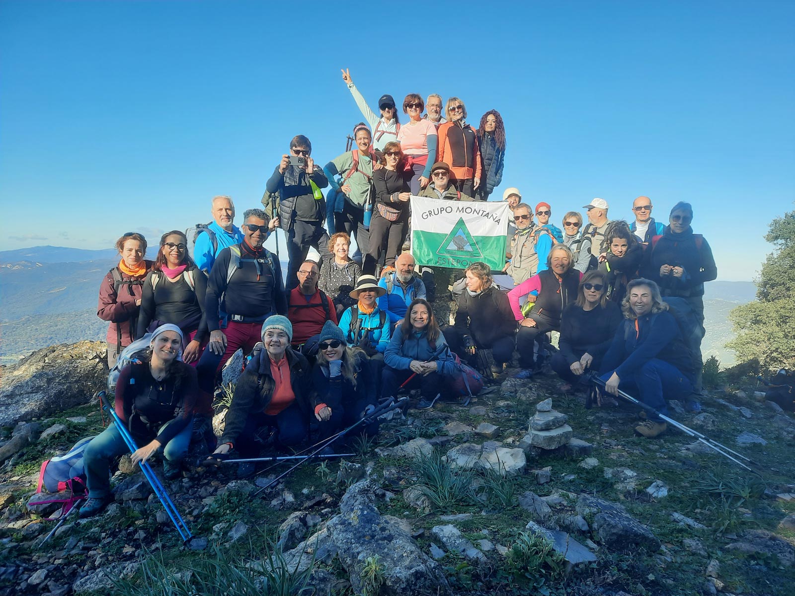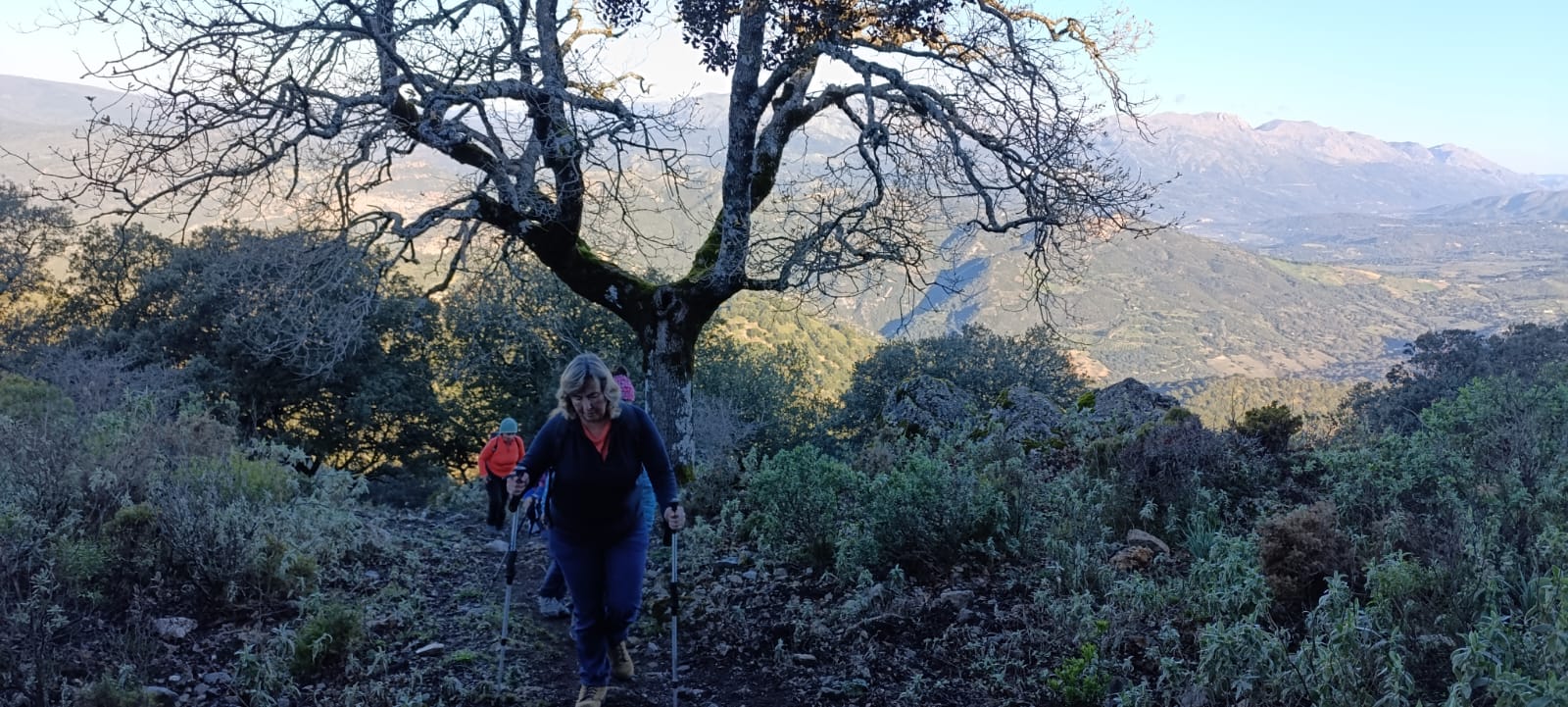 Reanudamos la marcha cresteando hacia el cercano Pico del Hacho de Gaucin, a escasos 300 metros desde donde nos encontramos, cuyo Vértice Geodésico nos indica que estamos a 1.011 metros sobre el nivel del mar. Emblemático lugar para la típica fotografía de grupo alrededor de dicho vértice, con bellas panorámicas muy admiradas y fotografiadas desde todos los ángulos, y que van desde el Mar Mediterráneo y la costa africana en lontananza, hasta los pequeños pueblos serranos que nos rodean de los Valles del Guadiaro y del Genal, Jimena de la Frontera y San Pablo de Buceite con la Sierra del Aljibe al fondo, enmarcados en las sierras colindantes.