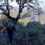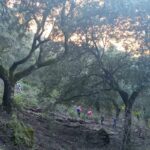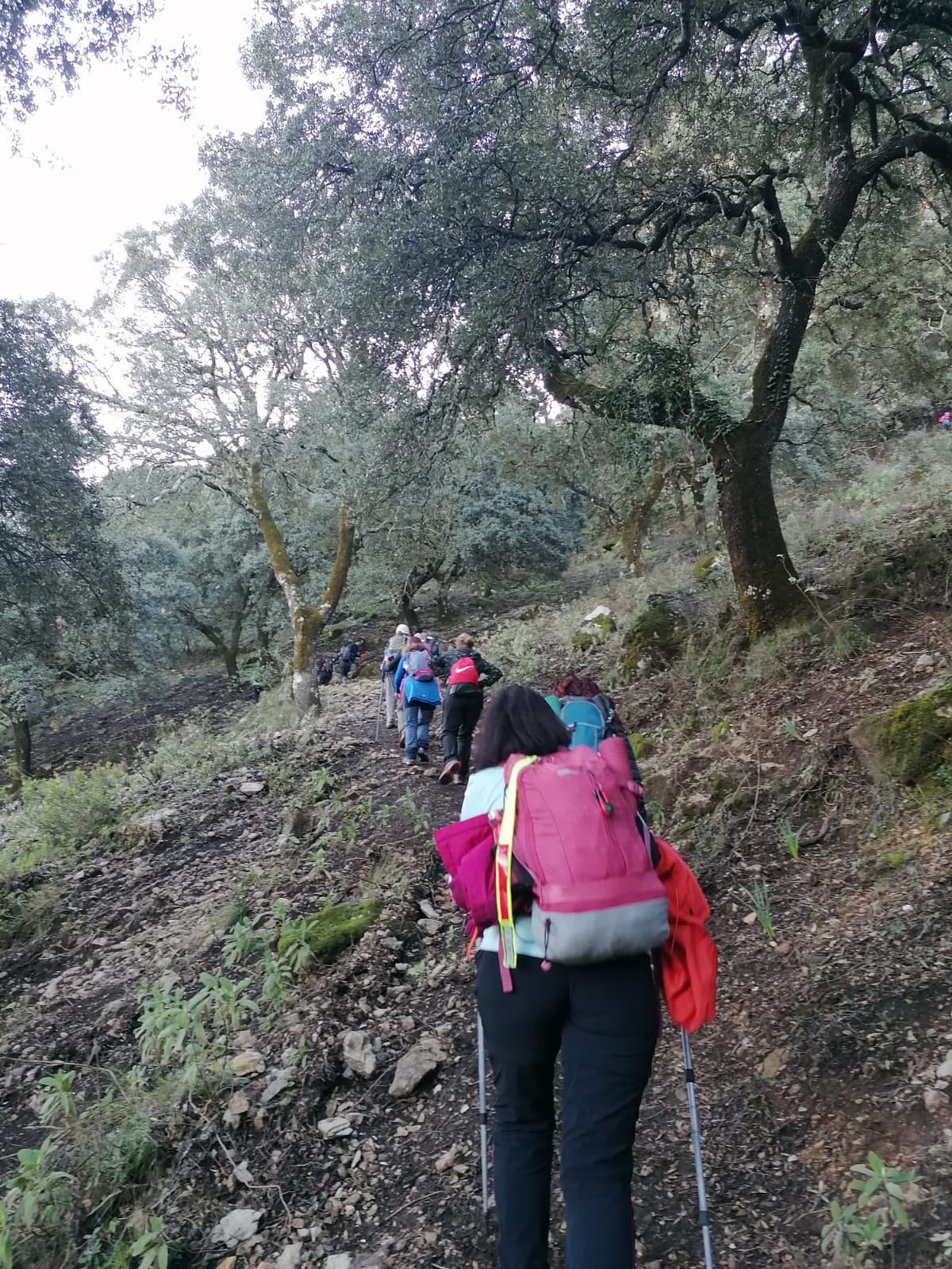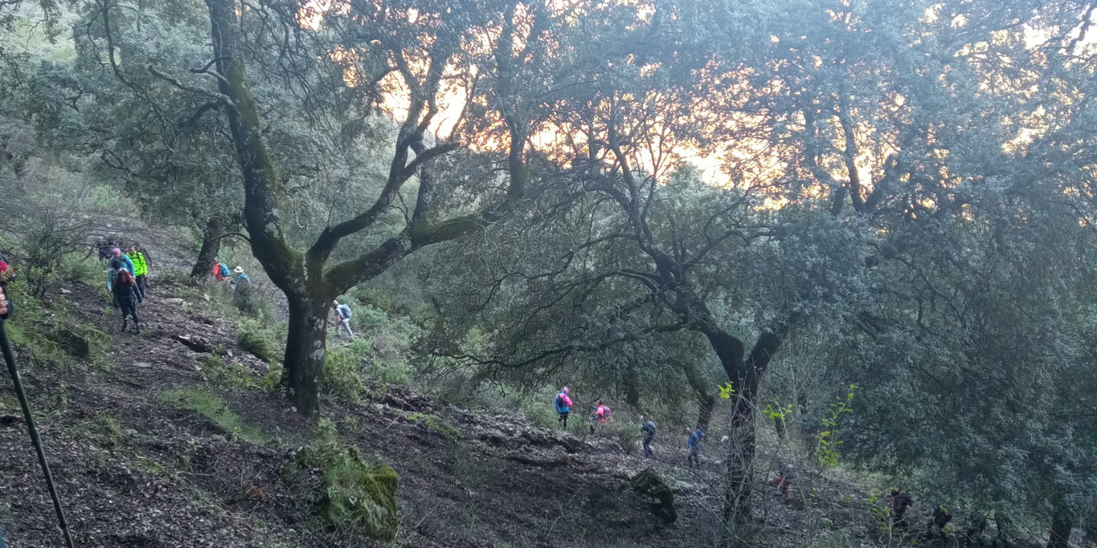 En el kilómetro 1,6 tenemos el cruce donde iniciamos el cambio del sentido de marcha mencionado anteriormente. Giramos a la izquierda en vez de continuar recto, y nos adentramos en el sendero PR-A-504, el cual nos conduce a la cumbre en zig-zag a través de una fuerte pendiente. Además de su elevado desnivel, este sendero es muy estrecho, está casi todo cubierto de piedras sueltas, hojas y bellotas secas caídas de los árboles, lo que lo convierte en un terreno muy resbaladizo, agravado aún más por la alta humedad del suelo como consecuencia de las últimas lluvias. Creo que hicimos bien haciendo la ruta al revés.