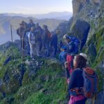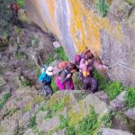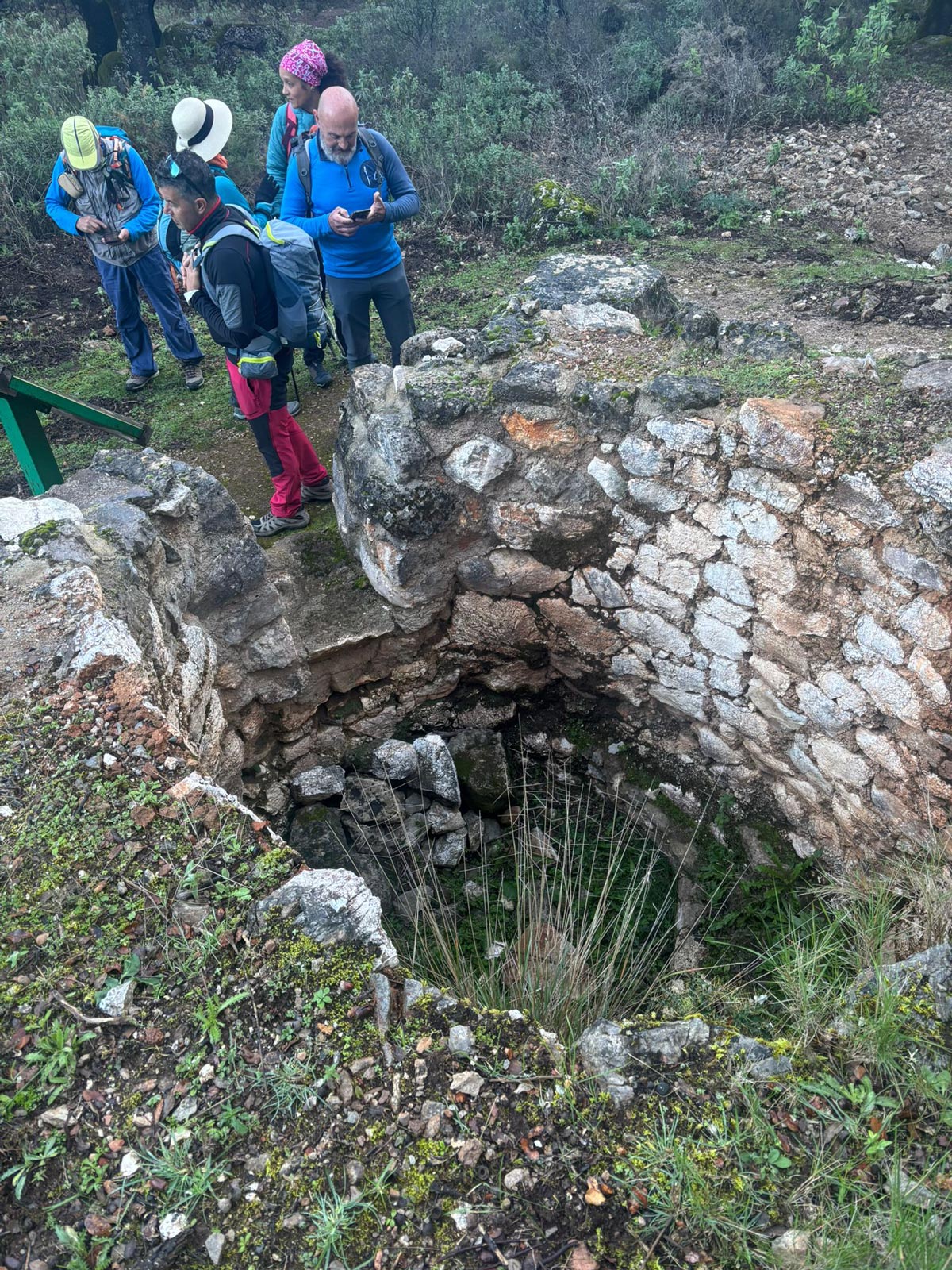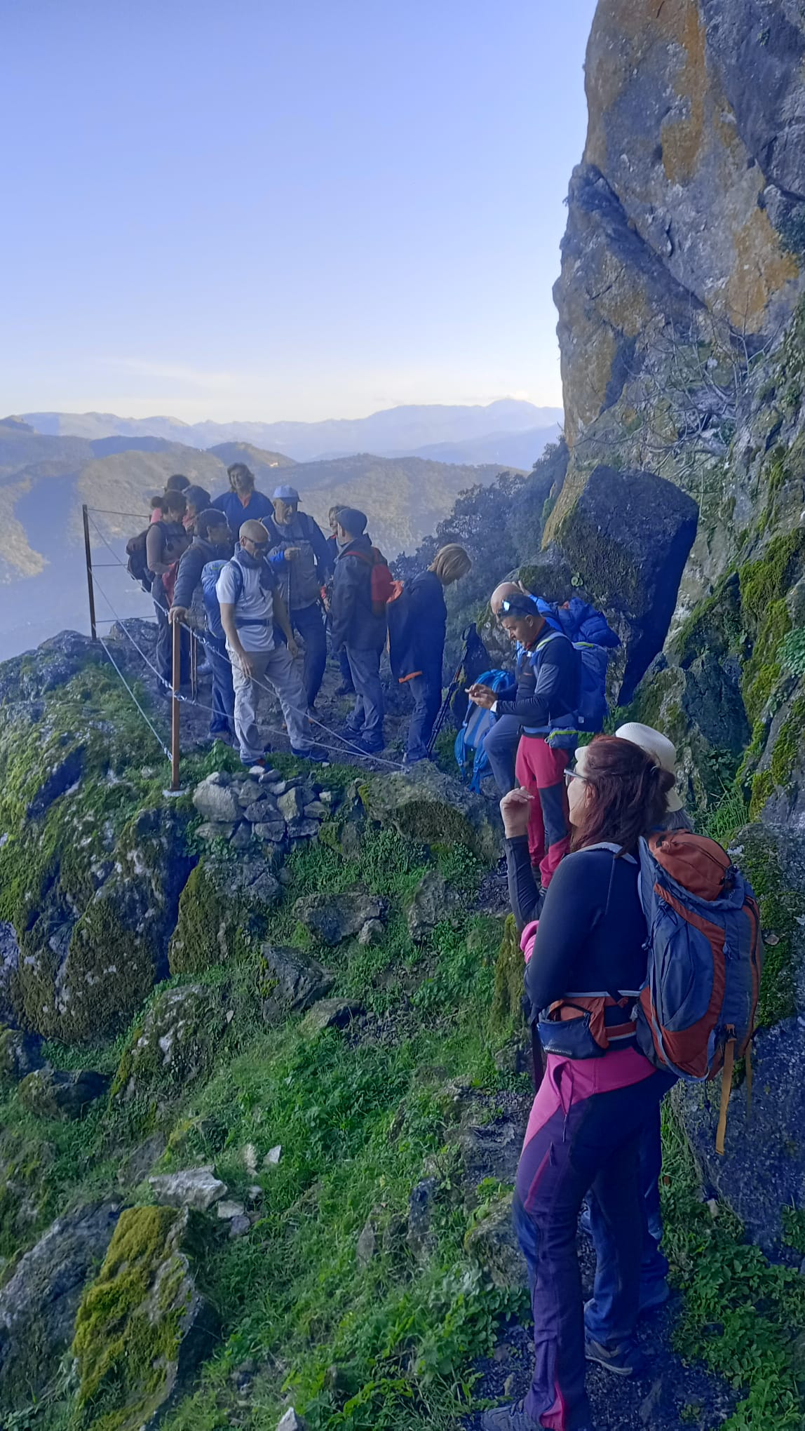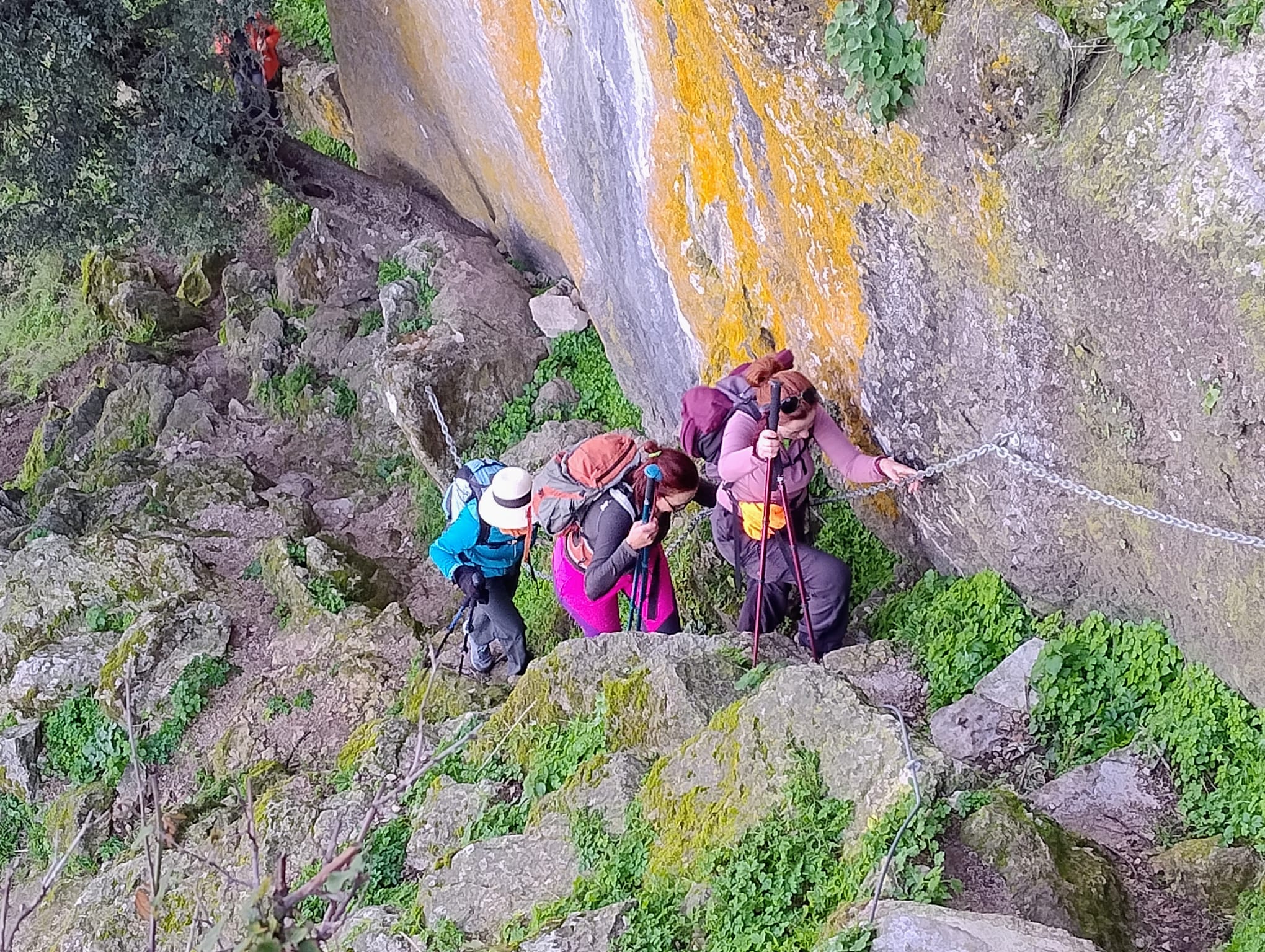 Pocos antes de llegar a dicha vía ferrata, hay que dejar el sendero y subir un pequeño tramo de unos 200 metros con un acusado desnivel, que cinco de nuestros compañeros decidieron no hacerlos y esperarnos en el cruce. Al reunirnos nuevamente en dicho lugar, notamos la ausencia de unos compañeros que andaban merodeando por los alrededores, sin haberlo notificado previamente, lo cual provocó el natural y preocupante desasosiego en el grupo, hasta que aparecieron al cabo de unos interminables minutos.