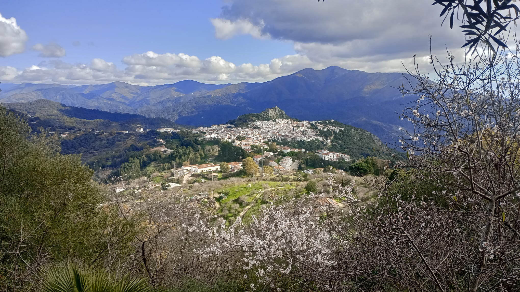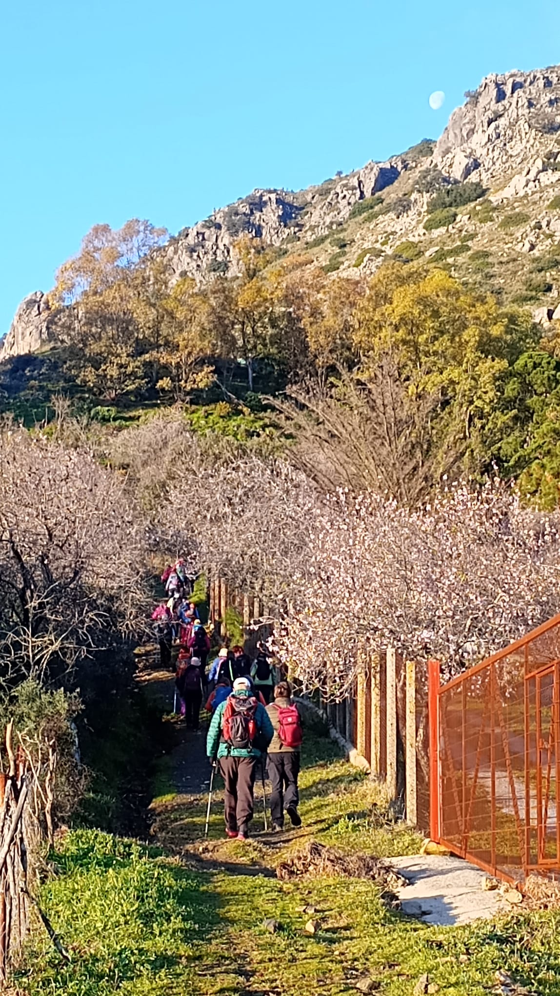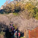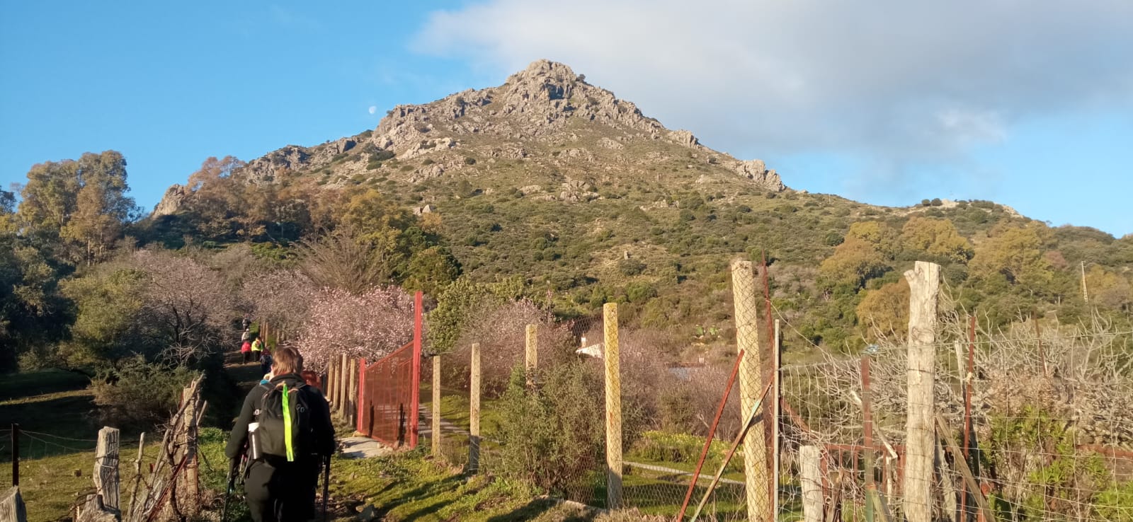 A las 09:10 horas comenzamos subiendo por detrás de la gasolinera, senderos GR-141 y PR-A-504, y pronto alcanzamos el Puerto de Los Hinojales caminando entre olivos y almendros en flor con buenas vistas del entorno que nos rodea; huertas, casas rurales y las vecinas sierras de Crestellina y Bermeja, y de frente El Hacho.