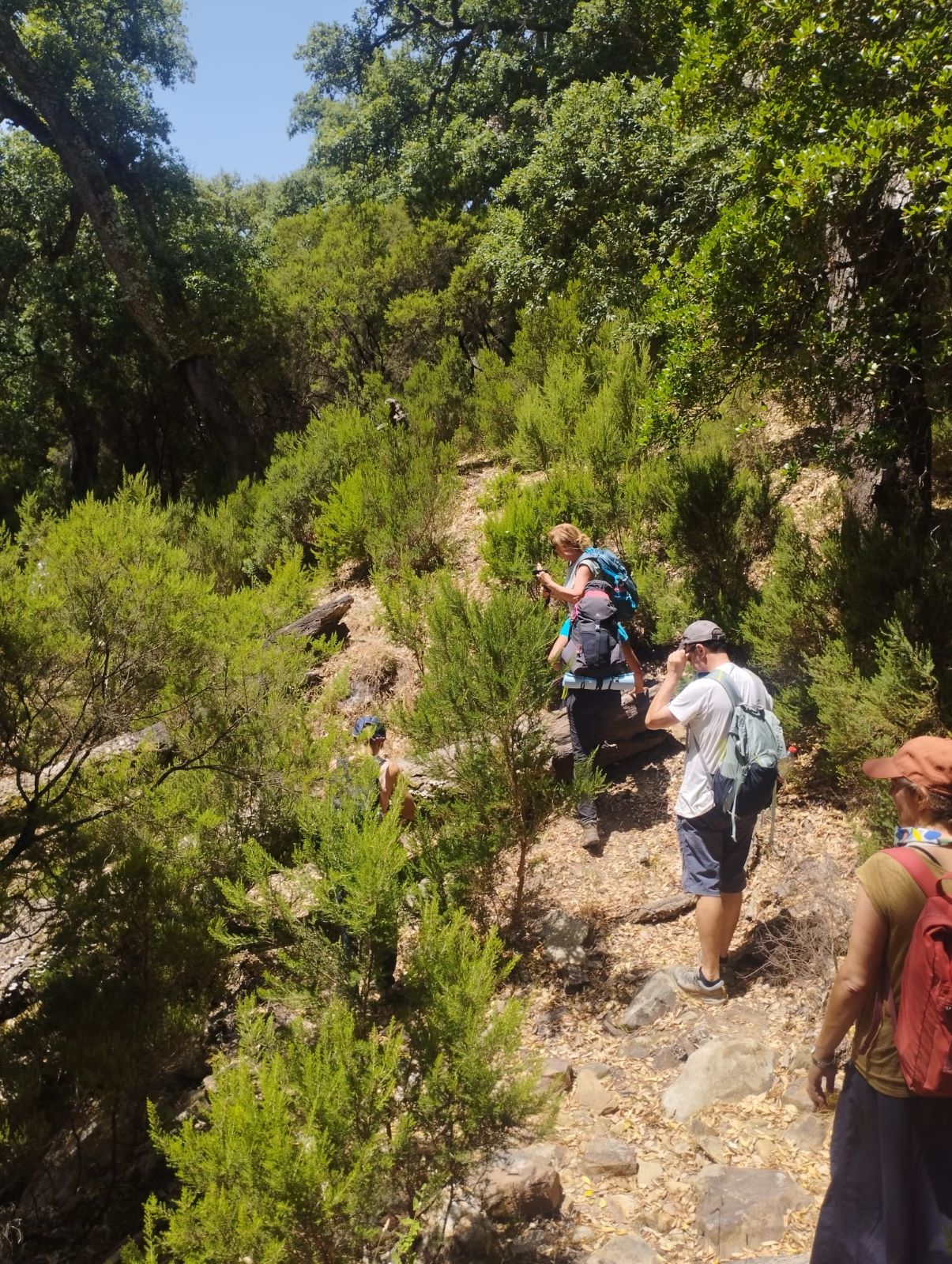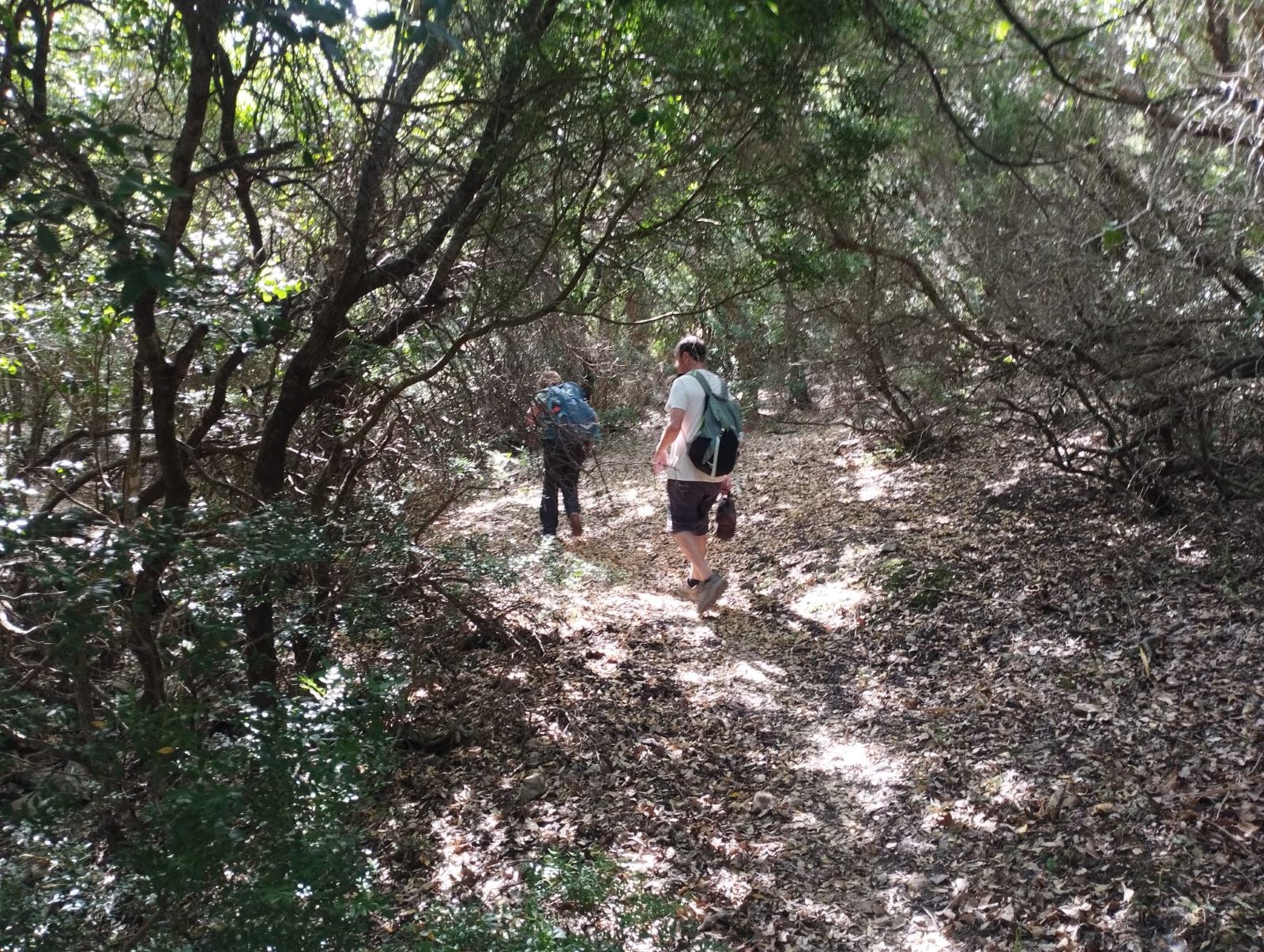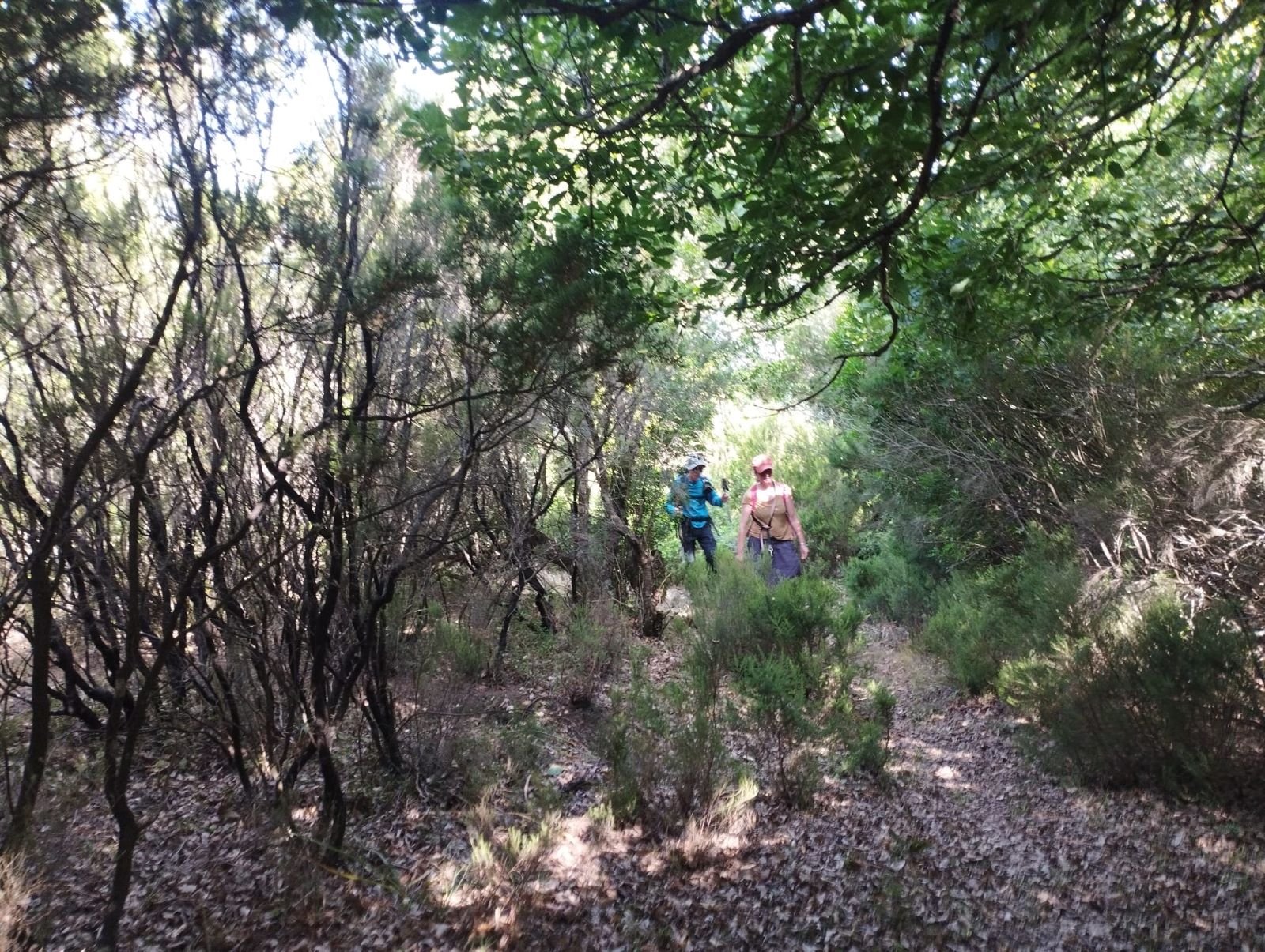 Reanudamos la marcha a través del bosque. Nos encontramos dos dificultades, la primera es que el sendero está muy cerrado por maleza, lo que dificulta el avance, y sufrimos arañazos en brazos y piernas, quienes se han aventurado a llevar pantalón corto. La segunda, es la dificultad en la orientación. El sendero está oculto y en diversas ocasiones tenemos que volver sobre nuestros pasos para encontrarlo.