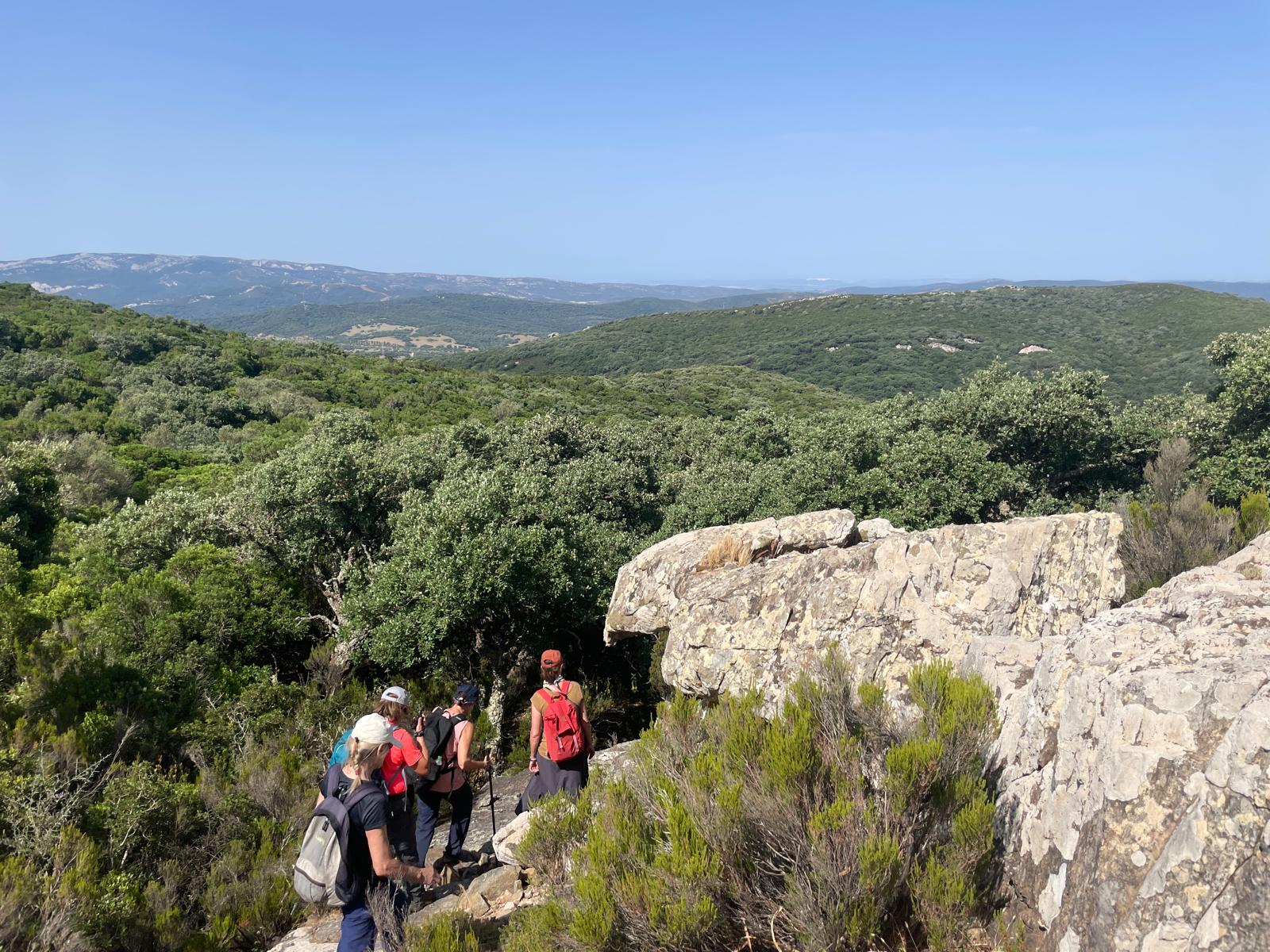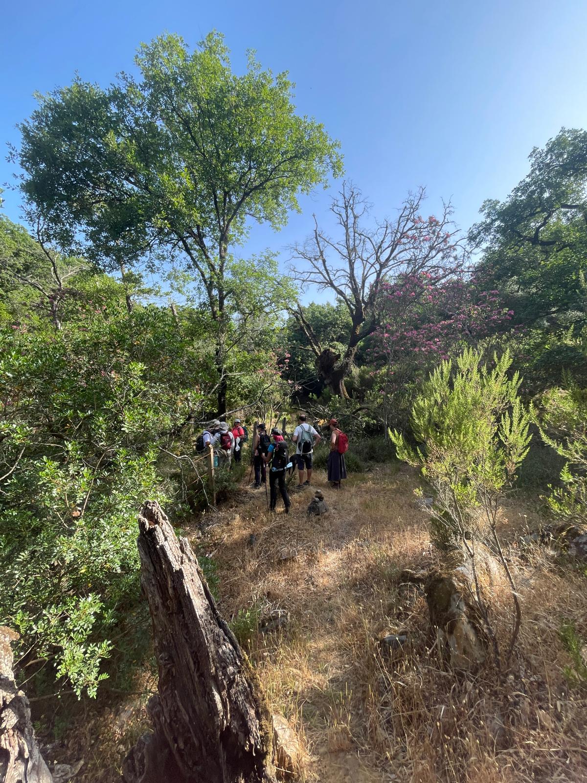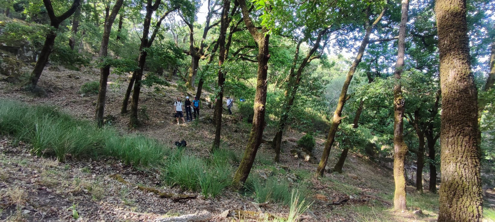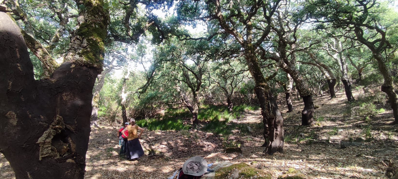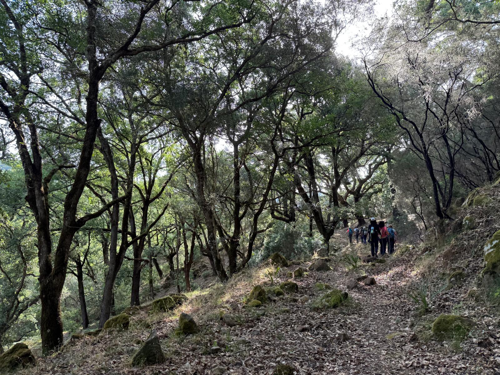 Caminamos sobre sendero estrecho, y nos adentramos en un precioso bosque, rodeados de alcornoques, abundante vegetación y preciosos helechos.