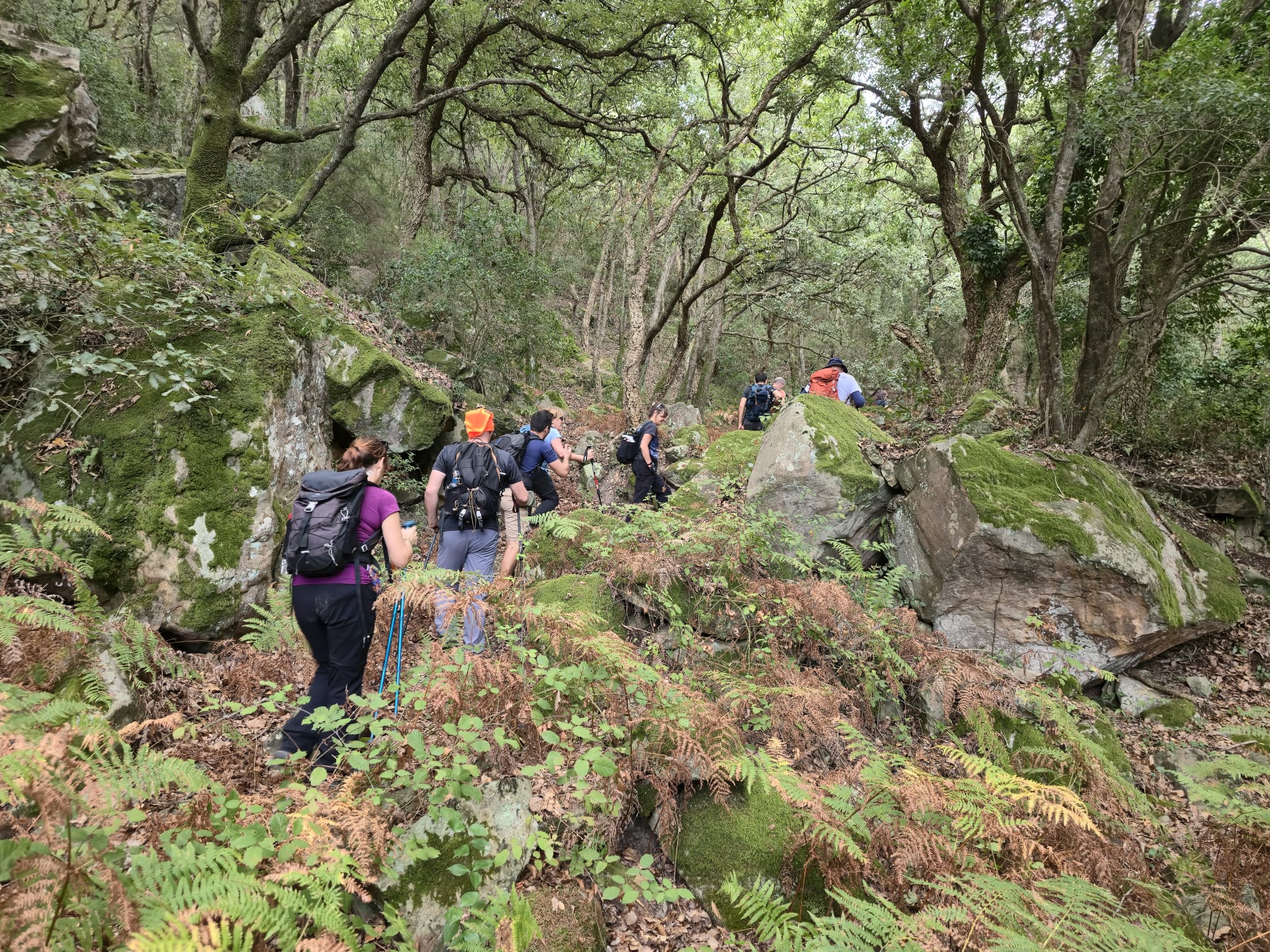 Iniciamos esta preciosa ruta circular a las 09:00. Sabíamos que nos encontraríamos con paisajes agradables a la vista, porque discurrió en el Parque Natural de los Alcornocales, pero dadas las lluvias del invierno pasado y que ya nos encontramos al inicio del otoño, estas fueron aún más bellas, además, el día nos acompañó con nubes altas, pero también bajas bastante grises y momentos de sol, lo que hacía que la naturaleza se viera a ratos de un color intenso y que oliera a humedad por el rocío o tal vez una lluvia reciente.