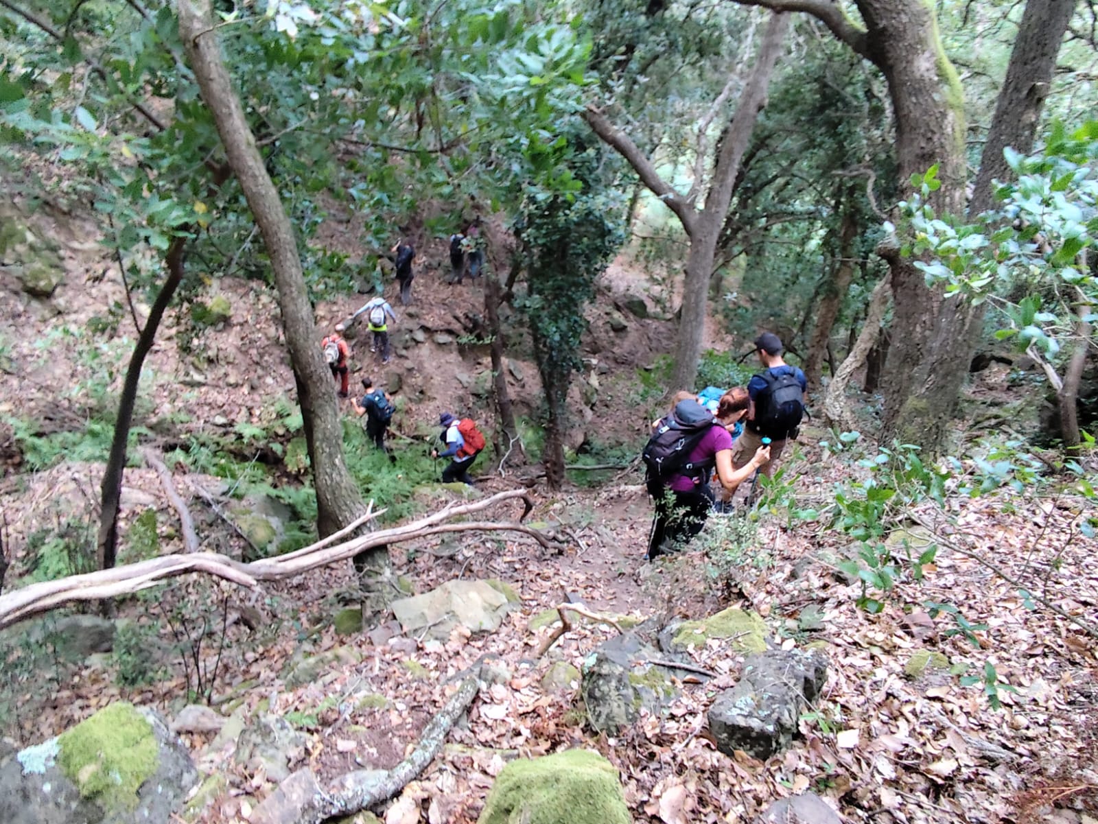 Seguidamente nuestra ruta nos llevó por senderos estrechos, desdibujados por la hojas amarillas y marrones en el suelo, propias del otoño, pero gracias a nuestros guías no tuvimos importantes desvíos. Lo hermoso, antes de llegar al siguiente hito, fue ver y oler hierbas aromáticas, destacando el Poleo, que vimos en varias partes del camino, además de setas.