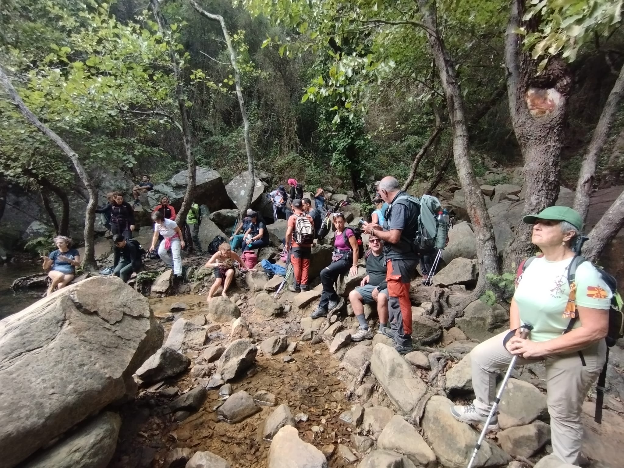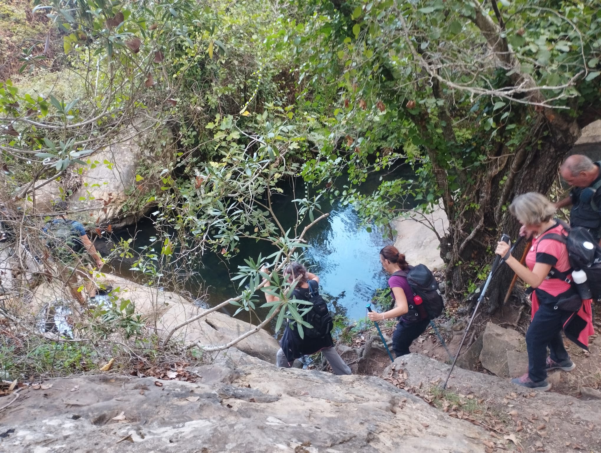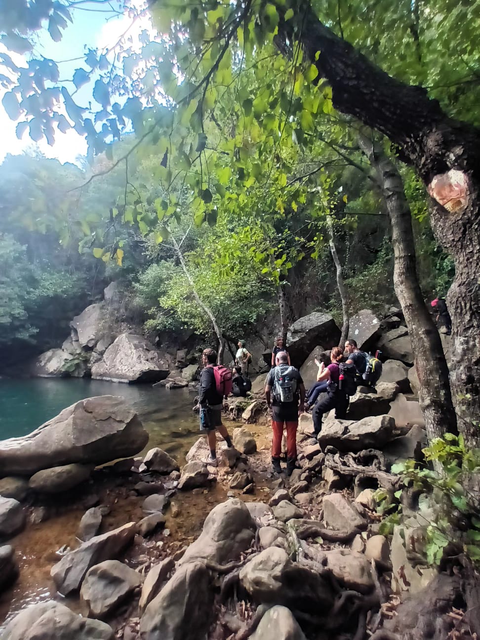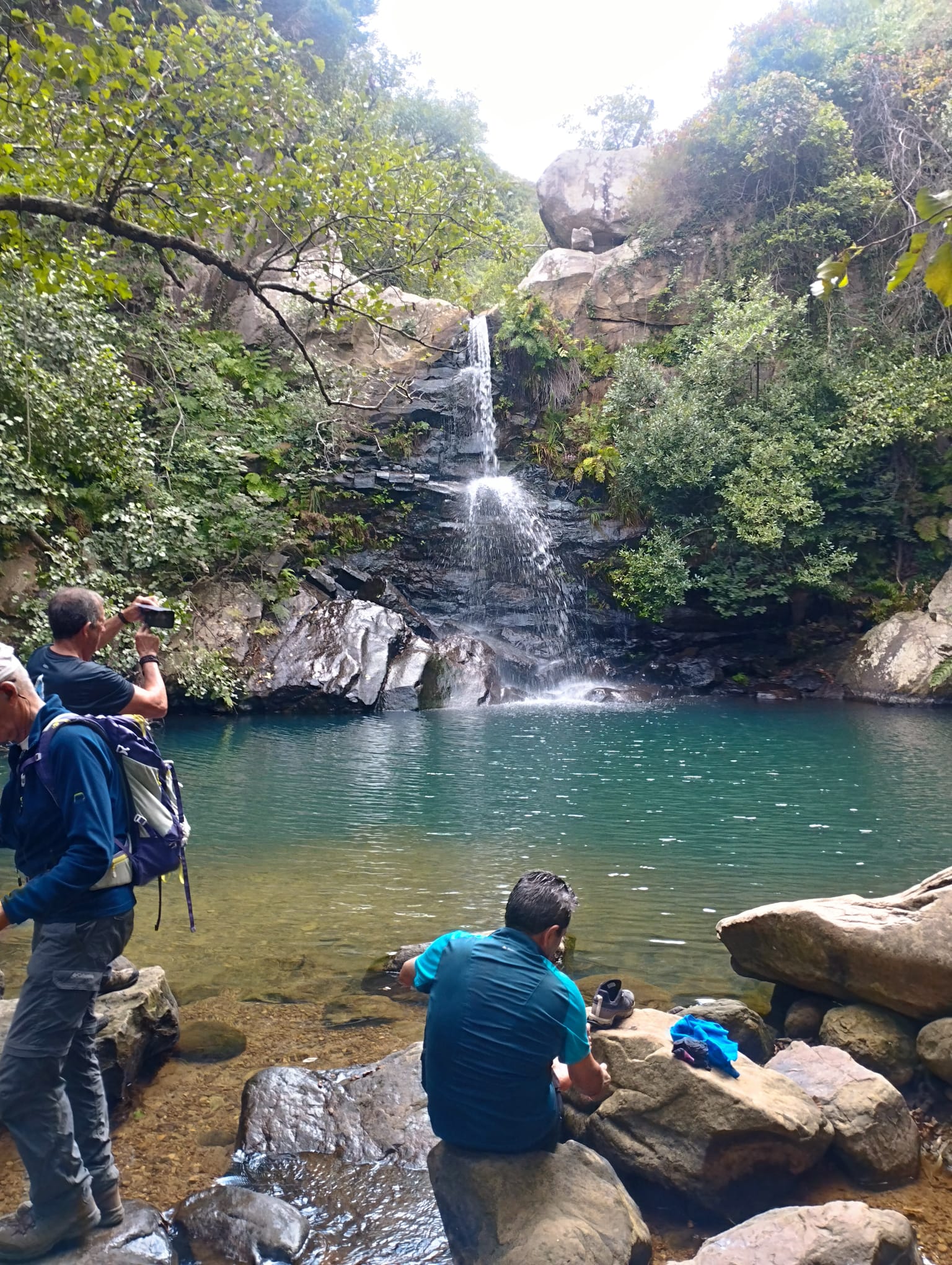 Después empezamos a volver, por otros senderos, igual de bellos que los primeros, pero que nos llevaron a otros sitios pendientes de la ruta. Como son la Garganta del Capitán, con agua cristalina y una preciosa cascada, donde varios refrescamos nuestros pies y alguno hasta se bañó de cuerpo entero, ante la envidia de todos, porque ya a esa altura estábamos sudados y acalorados.