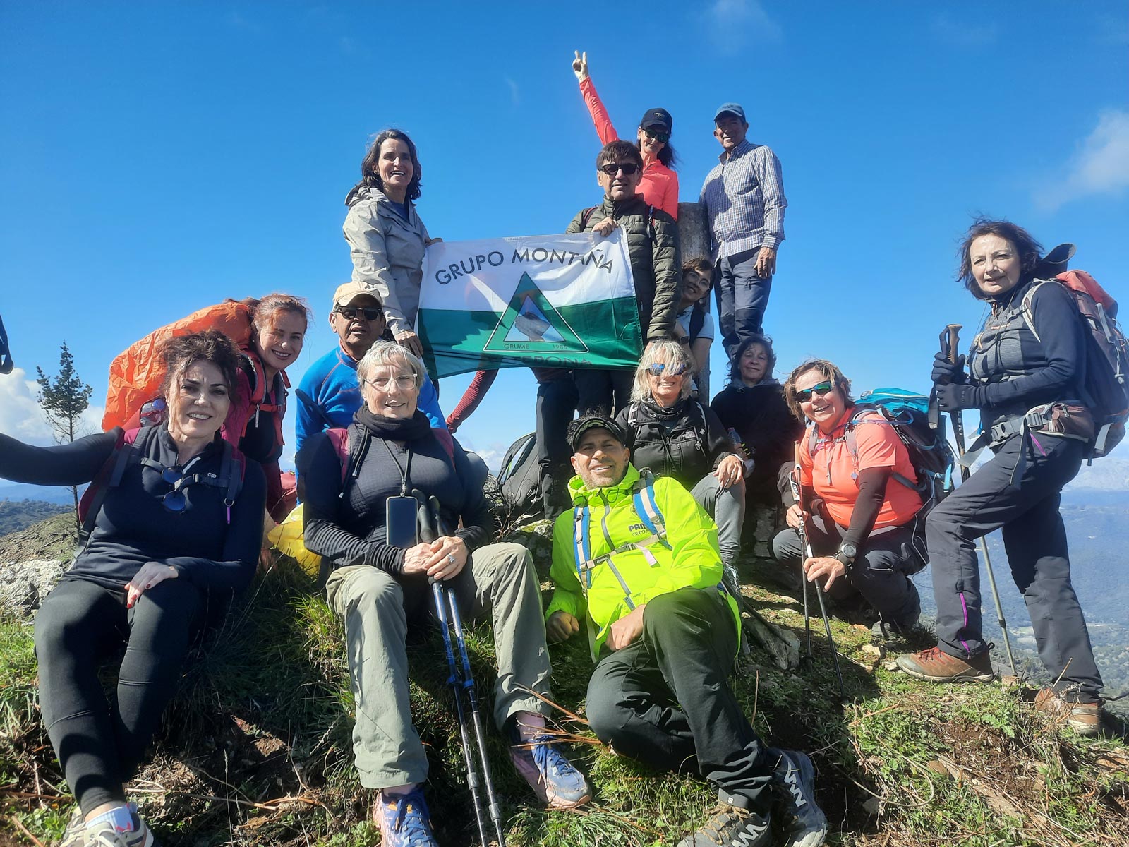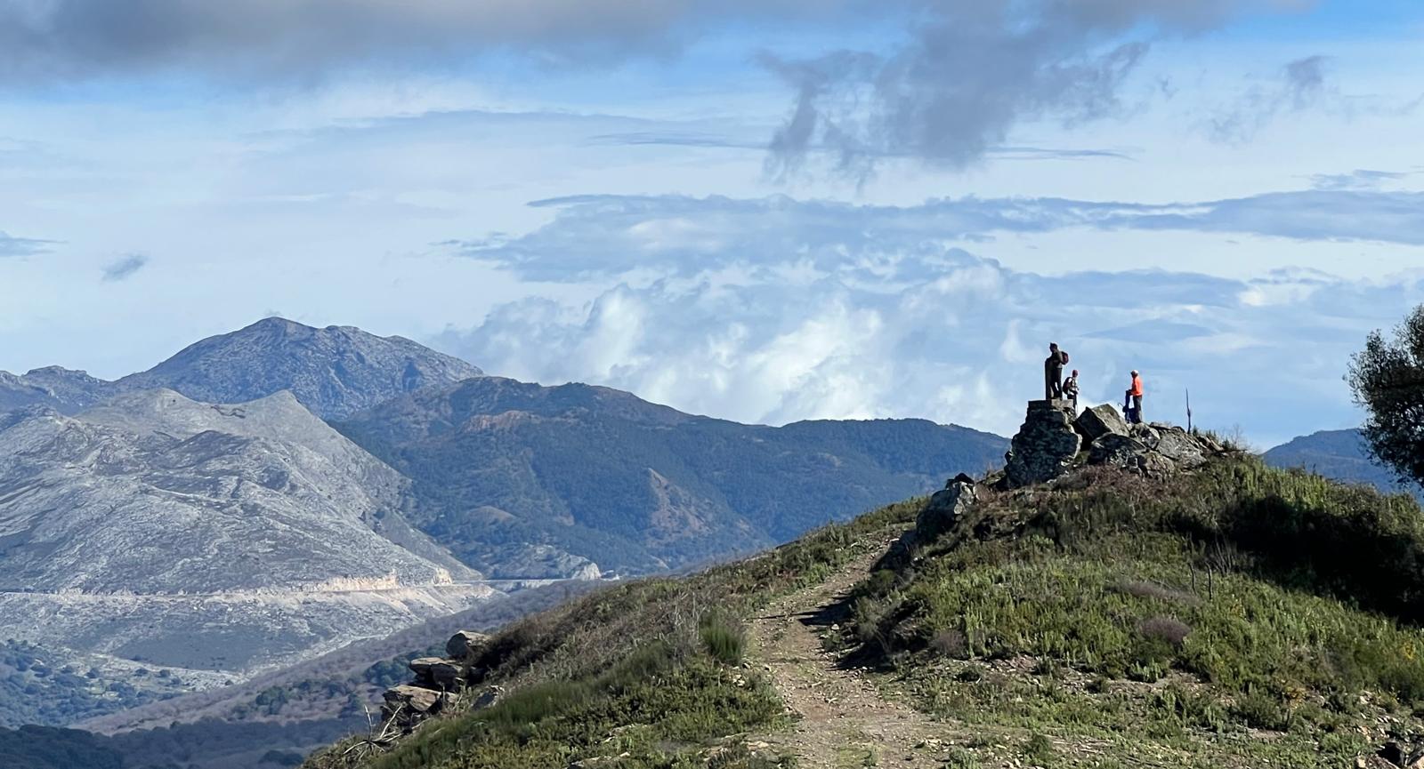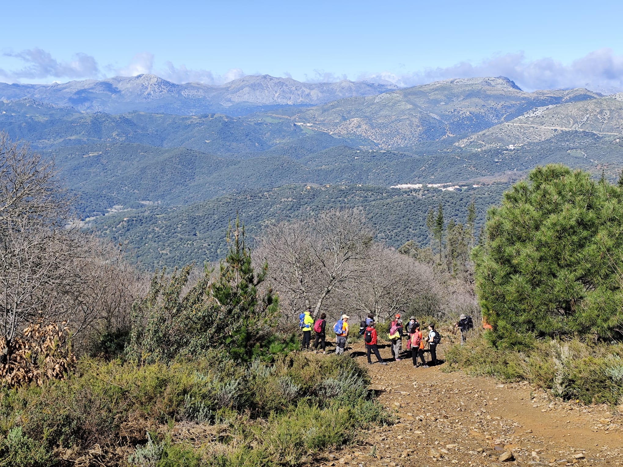 Llevamos andando 2,45 horas cuando alcanzamos el” Pico Jardón”. Estamos a 1.160 metros de altura. Nos reunimos todos para la foto de grupo y deleitarnos con las espectaculares vistas, podemos ver la Sierra Bermeja, el “Hacho de Gaucin” y la “Sierra Crestellina”. Nos acercamos a una especie de caseta de vigilancia forestal, e iniciamos el camino de vuelta a la parte circular de la ruta.