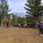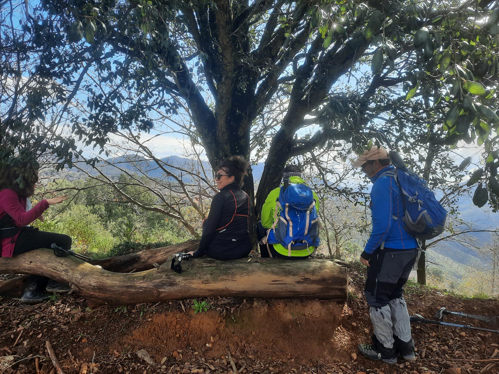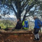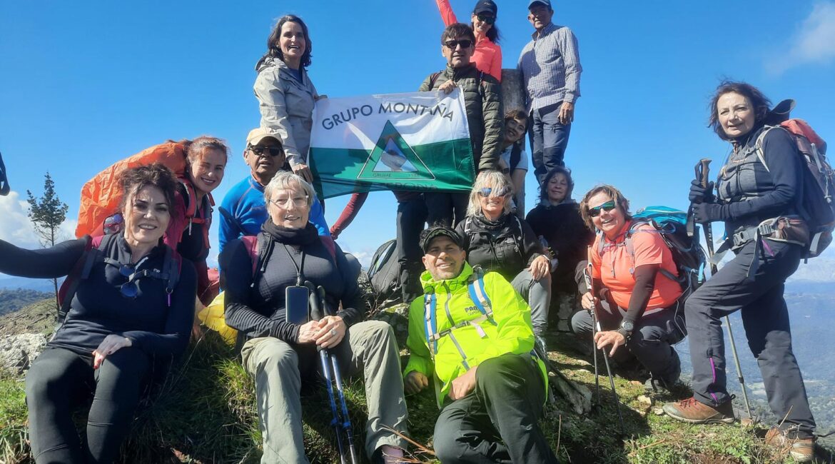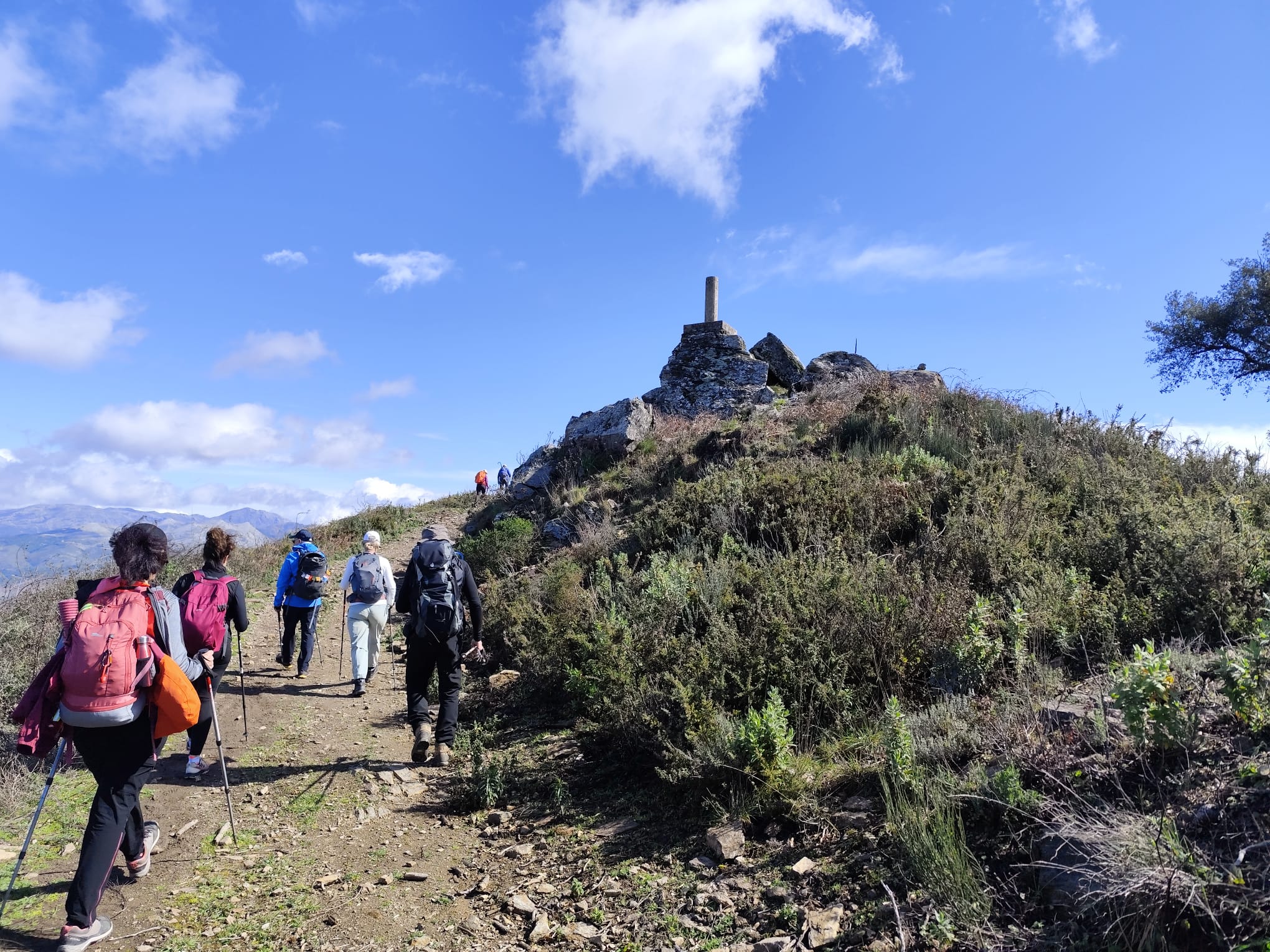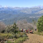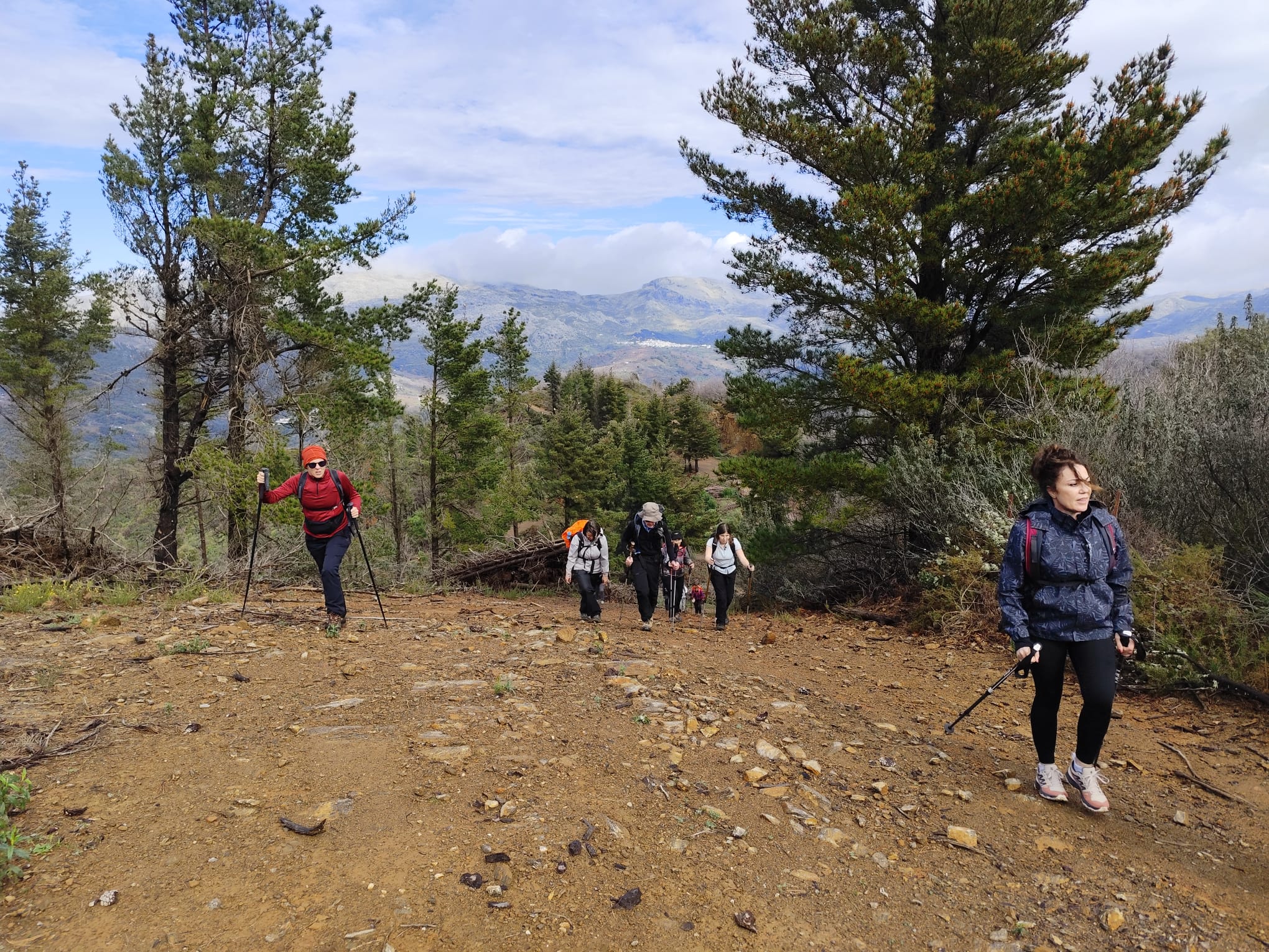 Llevamos andando 2,45 horas cuando alcanzamos el” Pico Jardón”. Estamos a 1.160 metros de altura. Nos reunimos todos para la foto de grupo y deleitarnos con las espectaculares vistas, podemos ver la Sierra Bermeja, el “Hacho de Gaucin” y la “Sierra Crestellina”. Nos acercamos a una especie de caseta de vigilancia forestal, e iniciamos el camino de vuelta a la parte circular de la ruta.