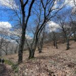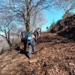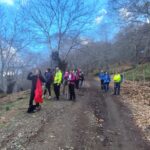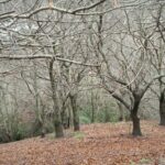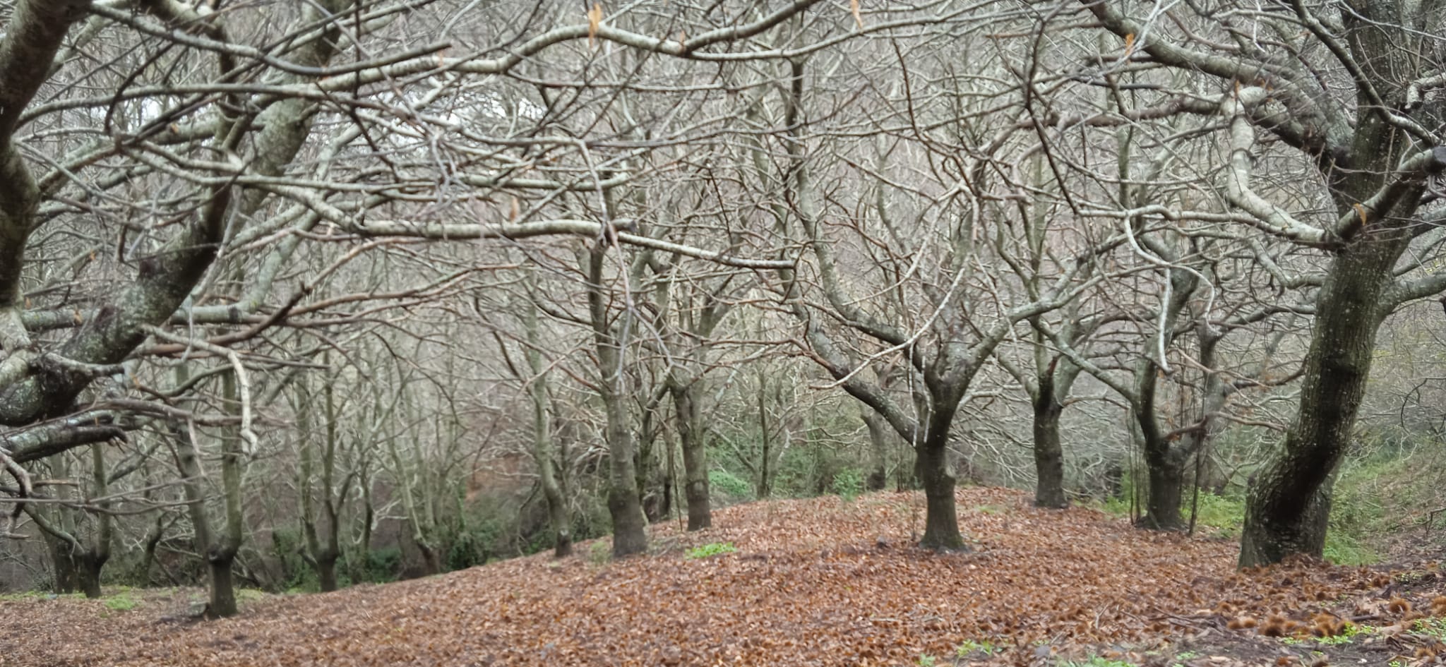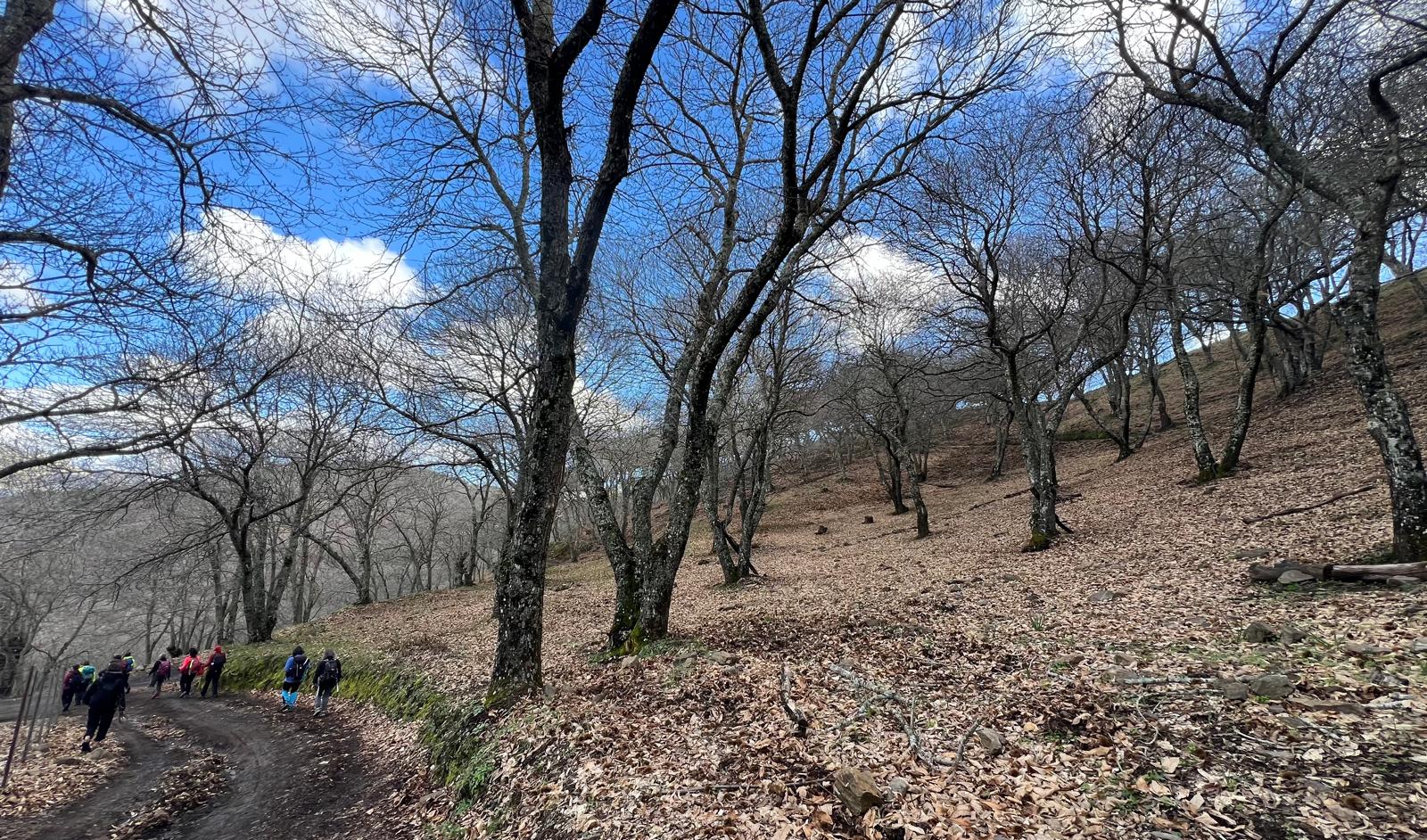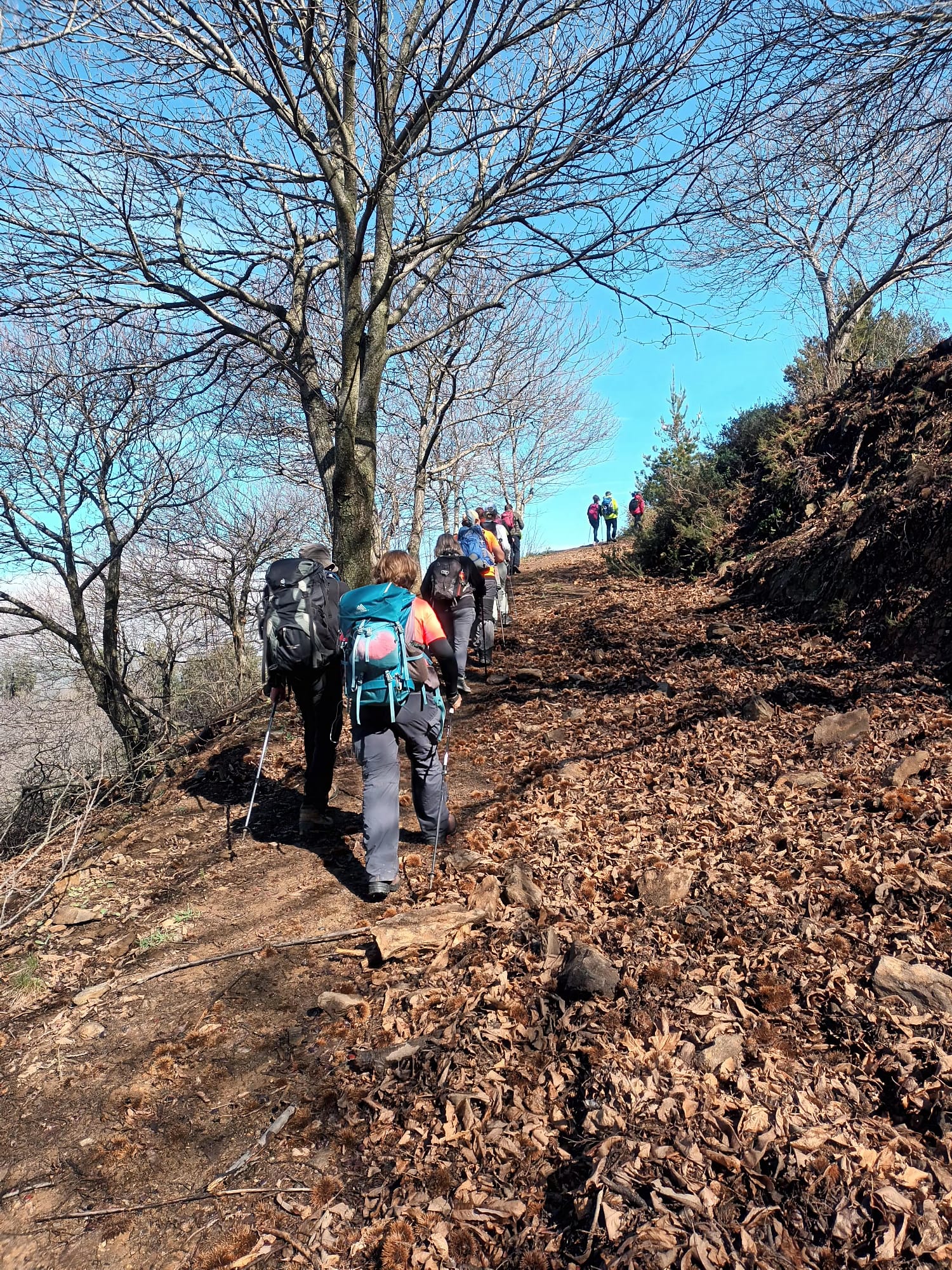 Nos encontramos con una especie de “cortafuegos con muy “mala sombra”. Fuerte pendiente. Difícil de bajar, nos obliga a poner todo el cuidado posible, el grupo avanza en completo silencio. Po fin se suaviza la pendiente y nos podemos relajar. Estamos rodeado de imponentes alcornoques y castañares, El suelo está cubierto de hojas de los castañares, que nos cubren hasta más arriba de los tobillos.