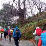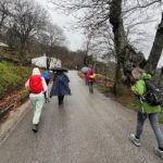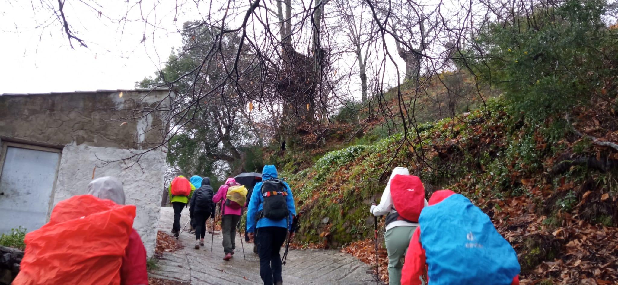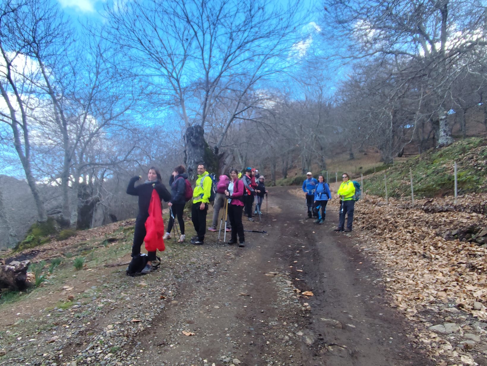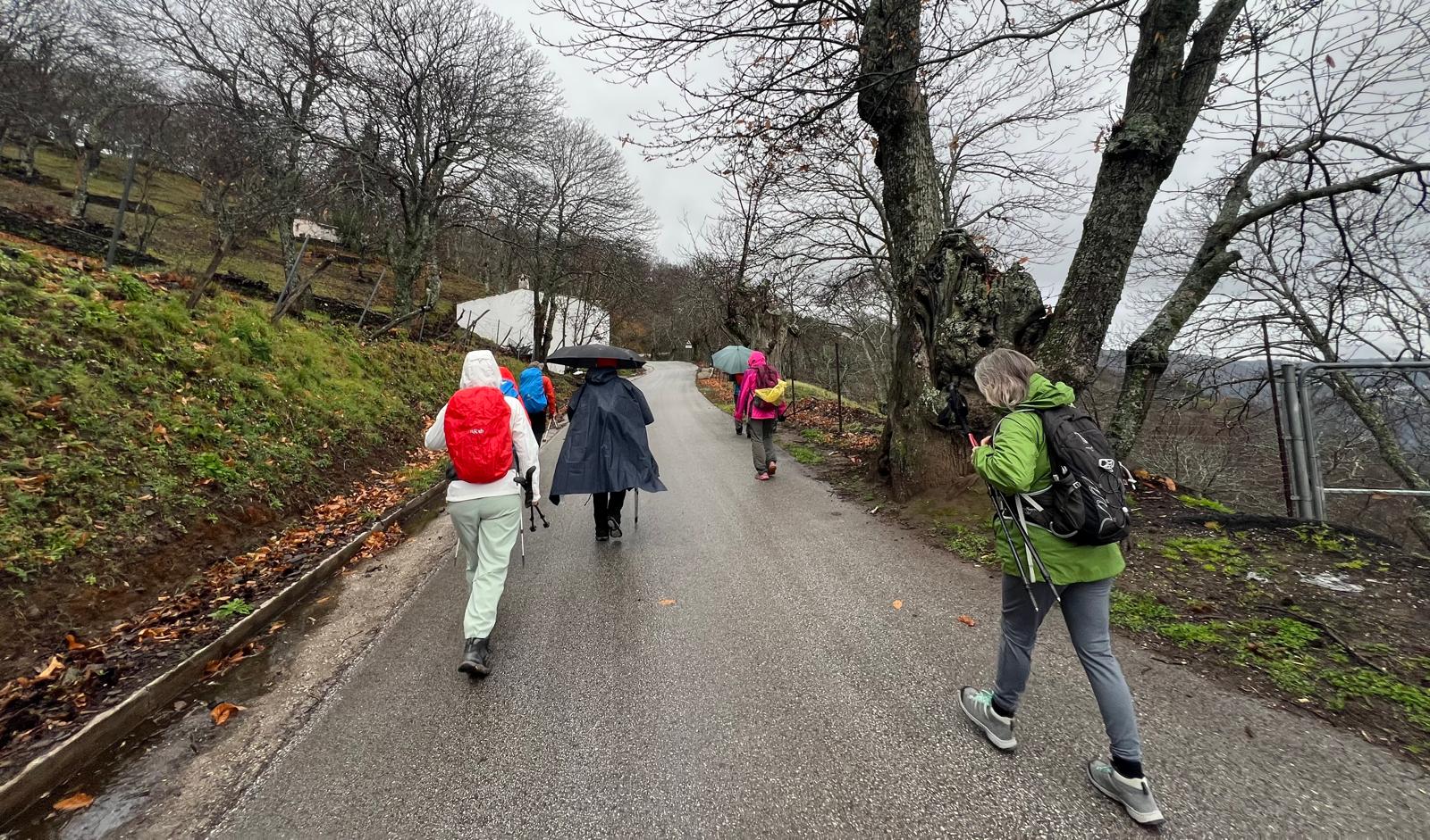 Llevamos 1,30 horas caminando. Estamos en el kilómetro 5,5 cuando paramos a tomar un tentempié. Hasta aquí la marcha ha sido cómoda, sin apenas desnivel, lo que permite al grupo charlar mientras caminamos. En el kilómetro 6 abandonamos el asfalto y nos desviamos por un carril con una pendiente muy fuerte, que más adelante se suaviza.
