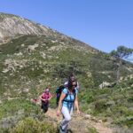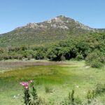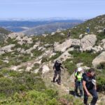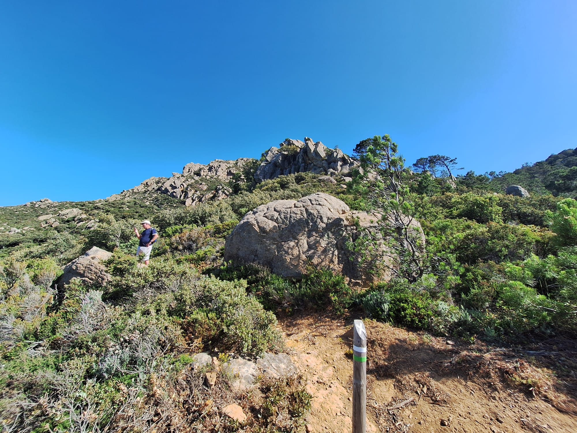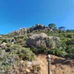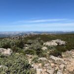 Entre continuas subidas y bajadas, inicialmente a través de estrechas veredas por zonas boscosas, y más tarde siguiendo un largo cortafuegos a cielo abierto, ascendemos levemente hasta la antecima del Aljibe, habiendo cruzado tres cancelas metálicas bien dispuestas para evitar el paso de animales.