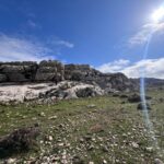 Pasamos sin pararnos junto a la fuente y el pilón de Las Alberquillas, por una senda muy bien marcada, hasta llegar a una meseta señalizada como “ruinas” en el “waypoint” del kilómetro tres, a 1.126 msnm. Se cuenta que son las ruinas de la casa familiar de Pasos Largos, el último bandolero andaluz muerto por la Guardia Civil en 1.934.