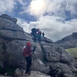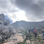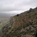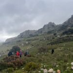 Poco a poco vamos ganando altura caminando casi todo el tiempo en “fila india” y avanzando con mucha lentitud, pues a lo expuesto anteriormente, hay que añadirle la falta de señalización en general y algún que otro problema de orientación, así como por la existencia de matorral bajo muy espinoso como aulagas, jerguenes. jaras, cardos, esparragueras, tomillo y abundantes raíces a ras de suelo que dificultan el paso.