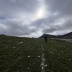 Ello, no obstante, también nos encontramos alternativamente con pequeñas sendas trazadas por el paso de animales y campo a través, tanto en subida como en bajada, con algunos tramos muy resbaladizos por el efecto de la humedad tanto sobre las rocas y piedras sueltas, como por el barro acumulado en nuestro calzado al pisar terreno reblandecido por las recientes lluvias.