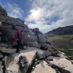 Un poco resguardados del viento y del intenso frío, aquí aprovechamos para reagruparnos y tomar un tentempié, mientras descansamos un poco de la corta pero fuerte subida que acabamos de realizar desde que cruzamos la carretera.
