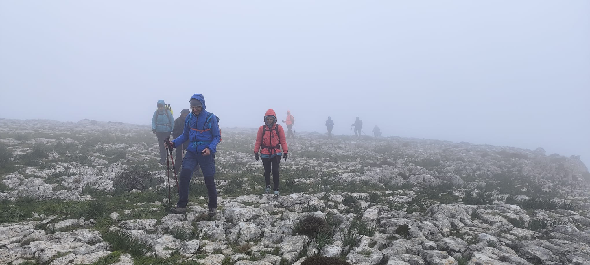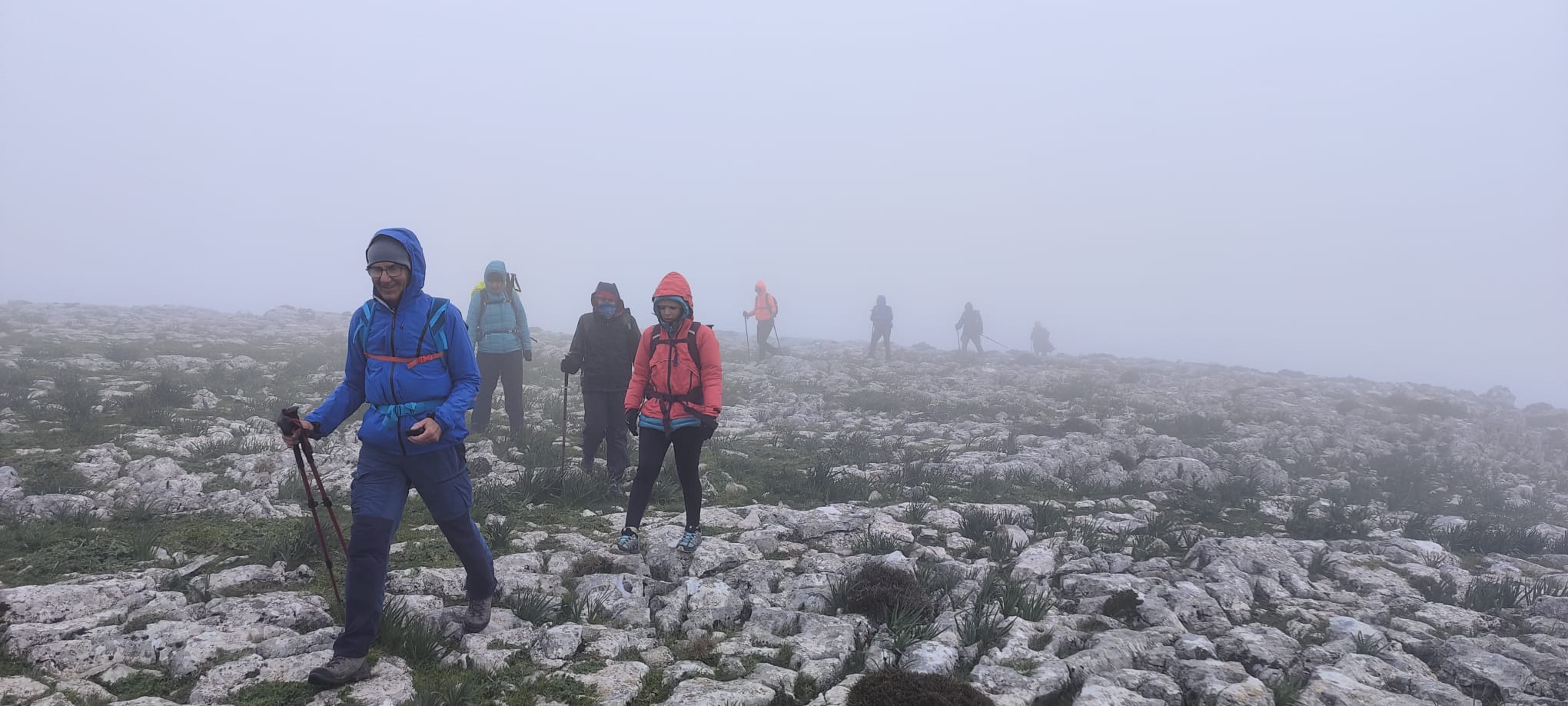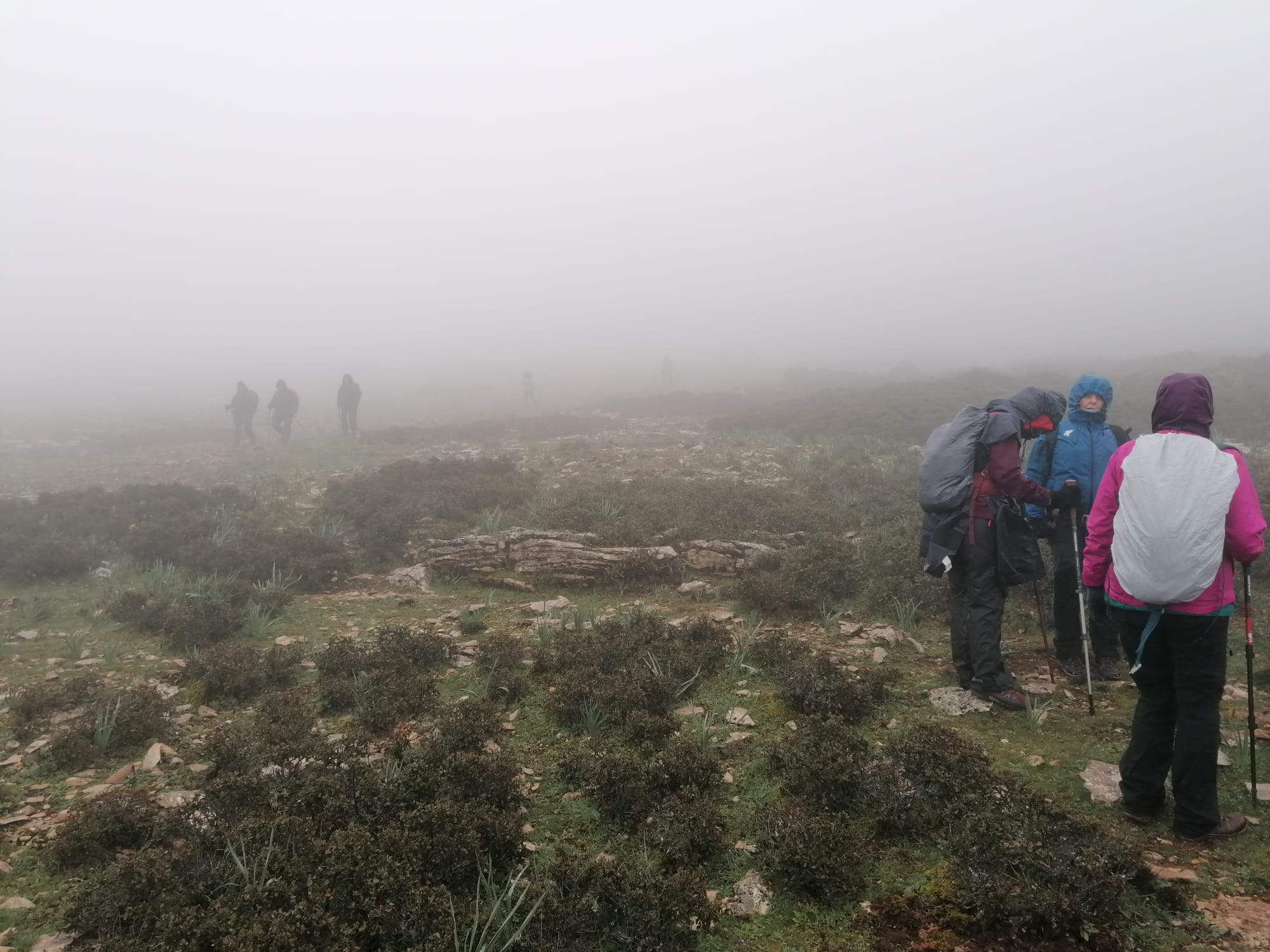 Así pues, iniciamos el camino de regreso en fuerte descenso, extremando todo tipo de precauciones, tanto para no perder el contacto visual entre el grupo, debido a la intensa niebla, como ante el riesgo de posibles caídas por las irregularidades y malas condiciones del terreno, según queda dicho más arriba.