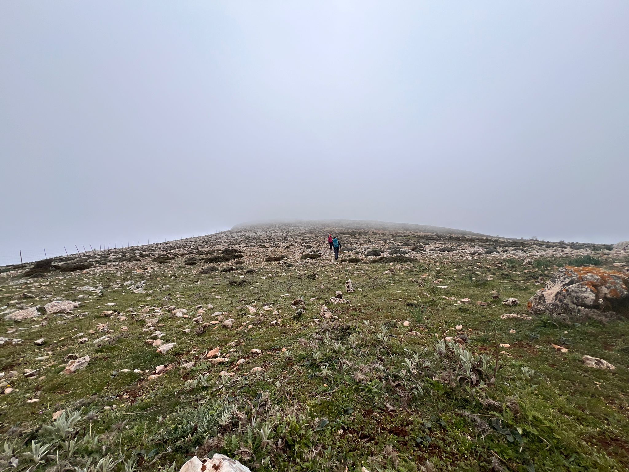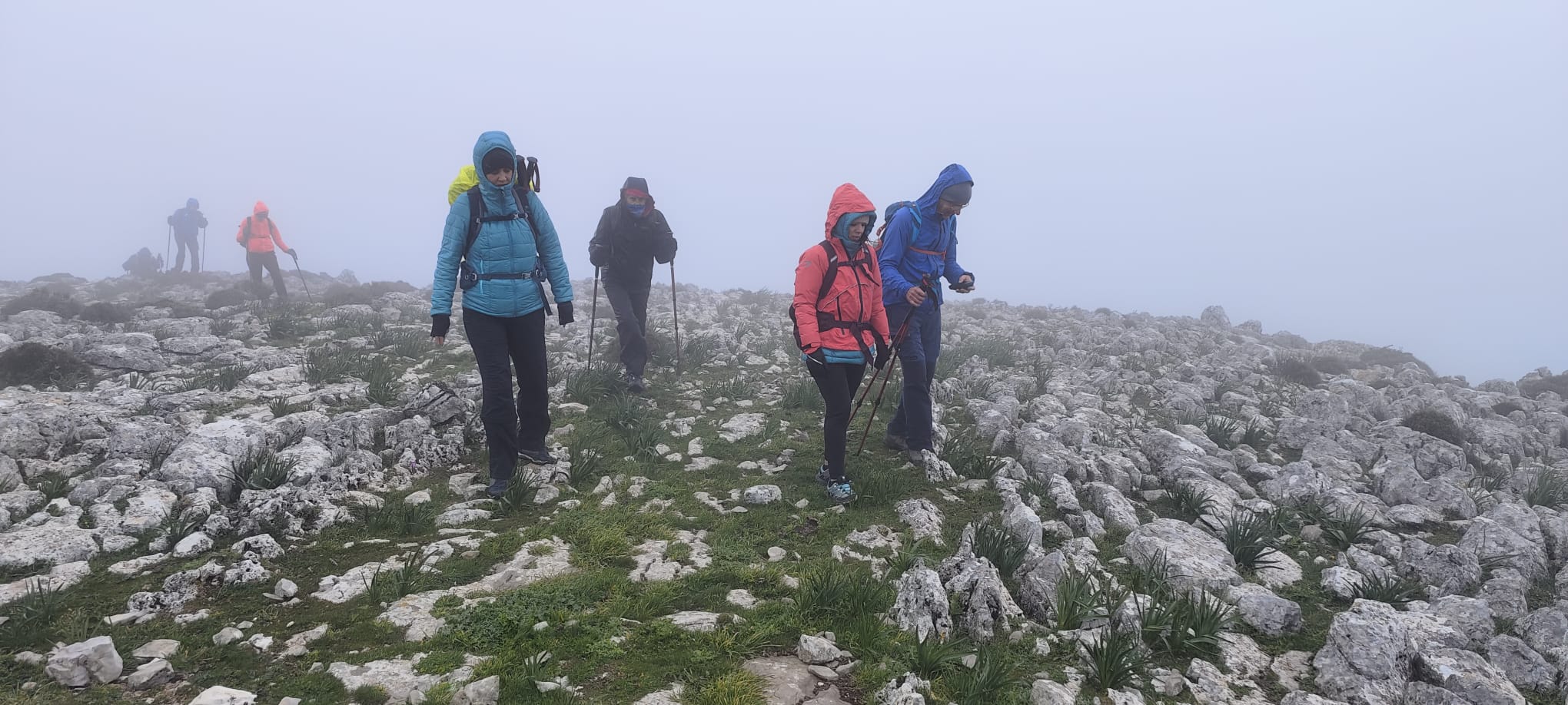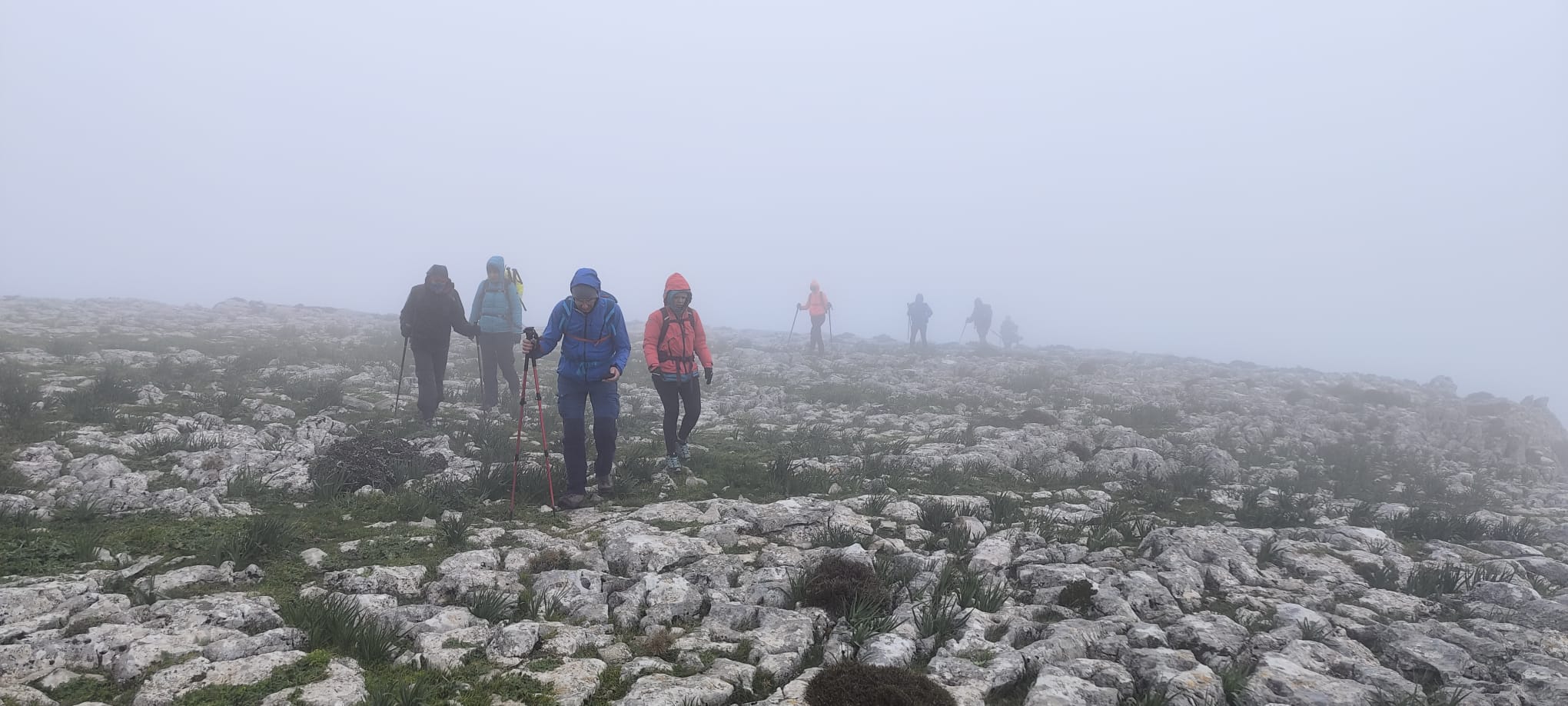 Así pues, iniciamos el camino de regreso en fuerte descenso, extremando todo tipo de precauciones, tanto para no perder el contacto visual entre el grupo, debido a la intensa niebla, como ante el riesgo de posibles caídas por las irregularidades y malas condiciones del terreno, según queda dicho más arriba.
