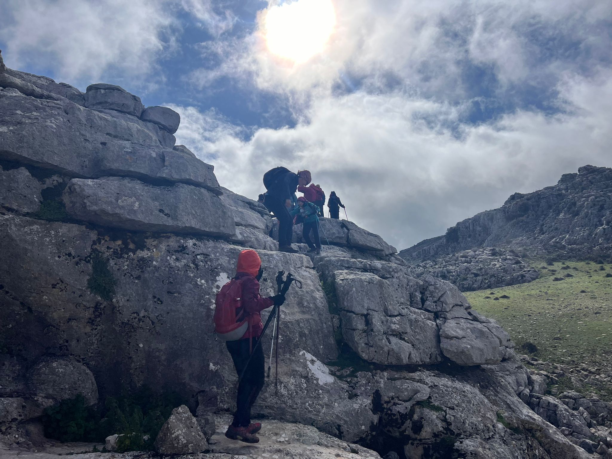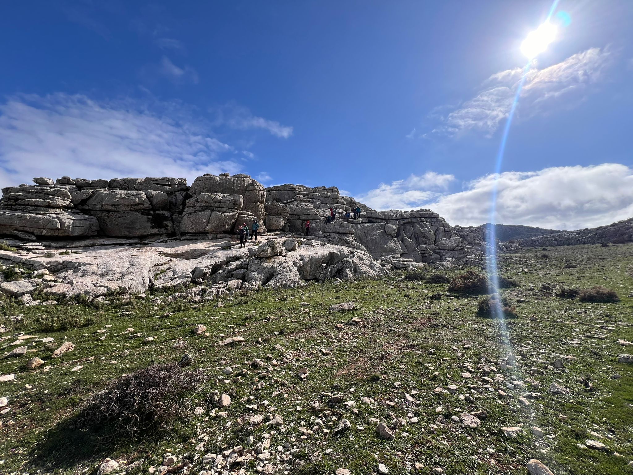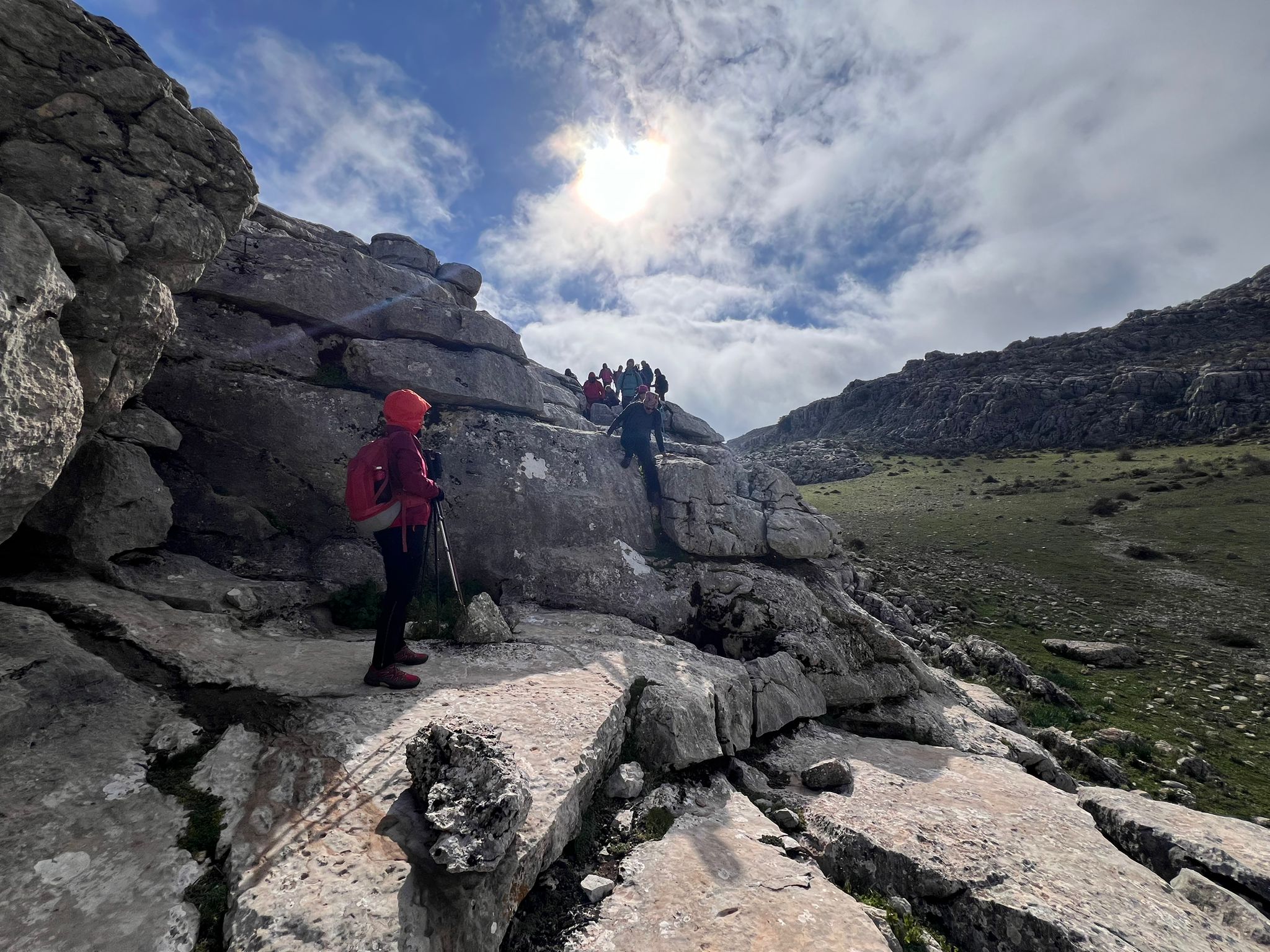 Un poco resguardados del viento y del intenso frío, aquí aprovechamos para reagruparnos y tomar un tentempié, mientras descansamos un poco de la corta pero fuerte subida que acabamos de realizar desde que cruzamos la carretera.