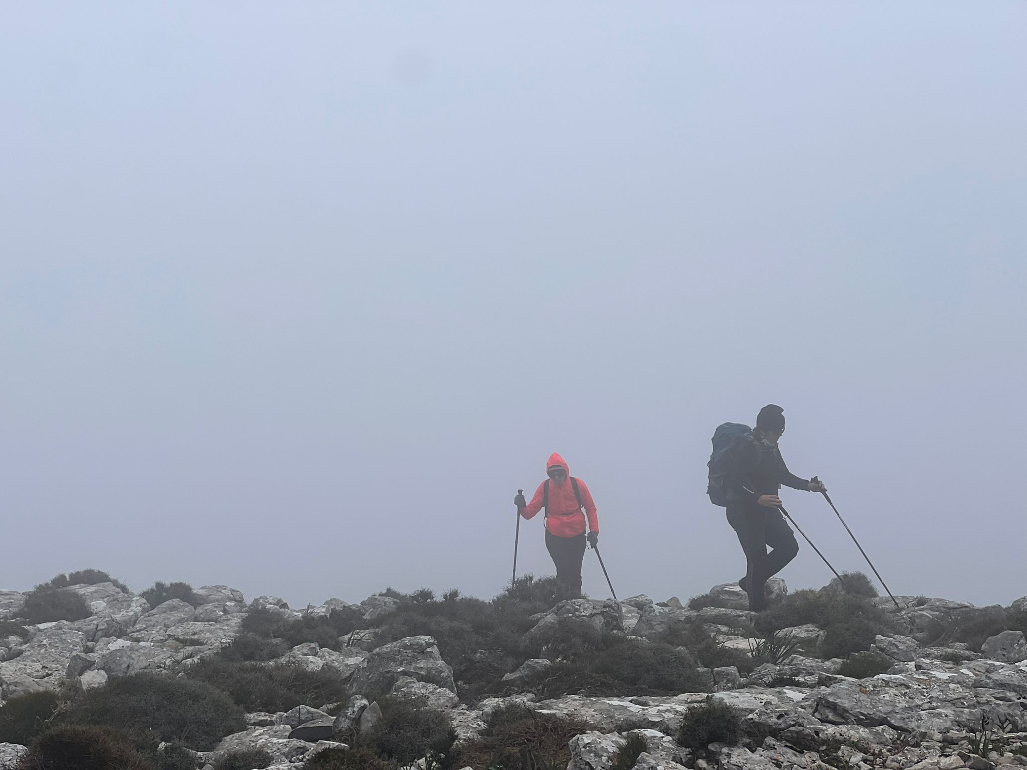 Otro obstáculo más a superar, una fría y densa niebla con escasa visibilidad, que viene a entorpecer la ya penosa marcha hacia la cumbre, sobre todo por el intenso aire frío y las fuertes rachas de viento que venimos soportando desde el comienzo, con sensación térmica de bajo cero.