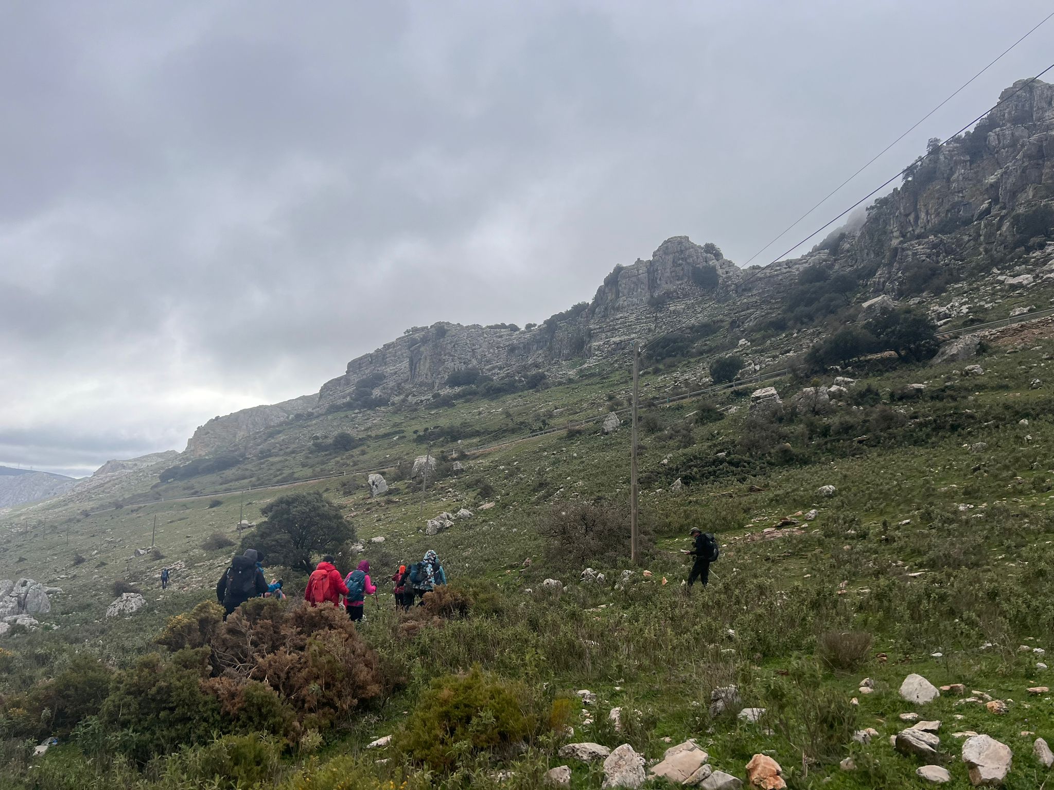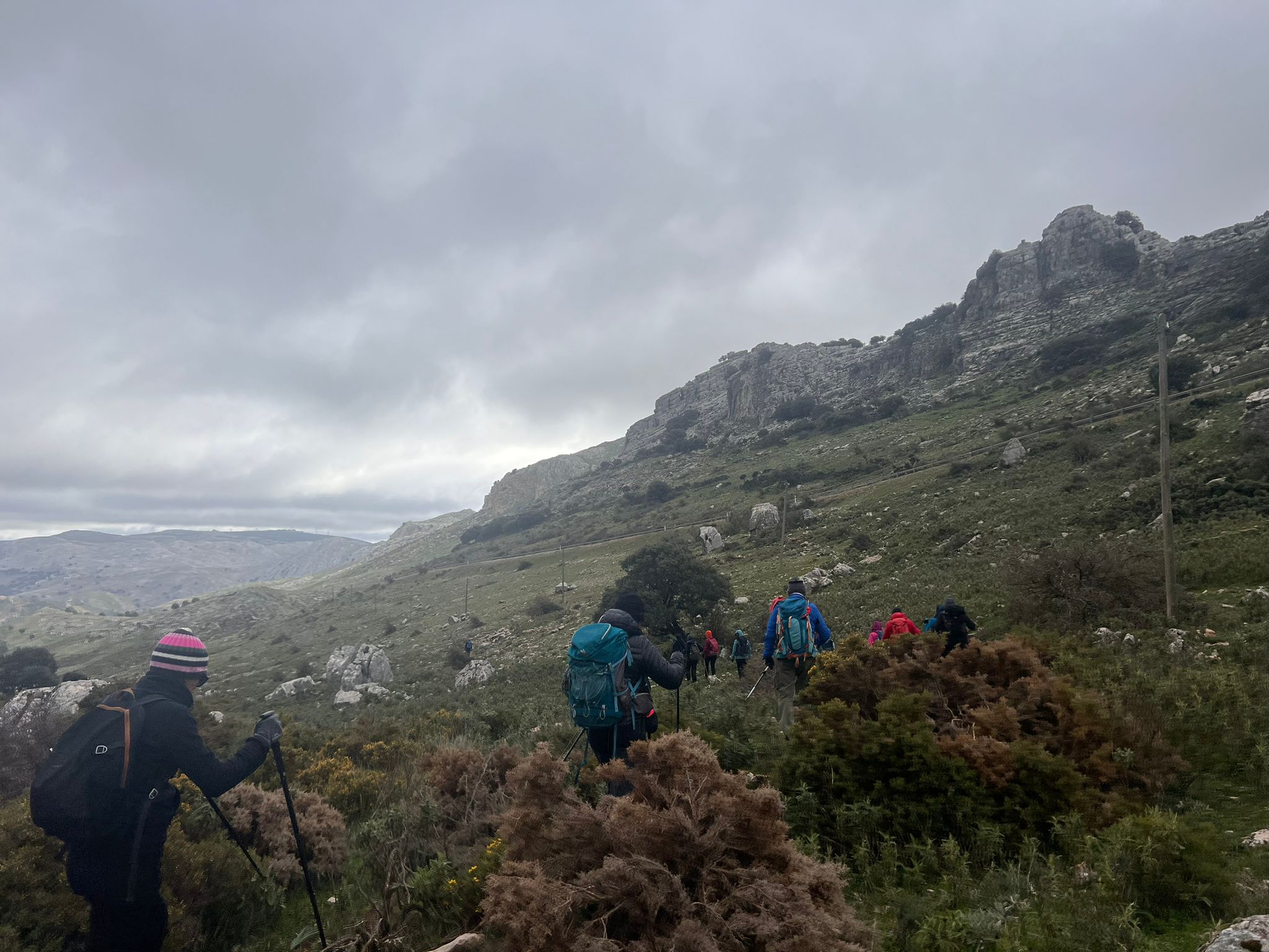 Poco a poco vamos ganando altura caminando casi todo el tiempo en “fila india” y avanzando con mucha lentitud, pues a lo expuesto anteriormente, hay que añadirle la falta de señalización en general y algún que otro problema de orientación, así como por la existencia de matorral bajo muy espinoso como aulagas, jerguenes. jaras, cardos, esparragueras, tomillo y abundantes raíces a ras de suelo que dificultan el paso.