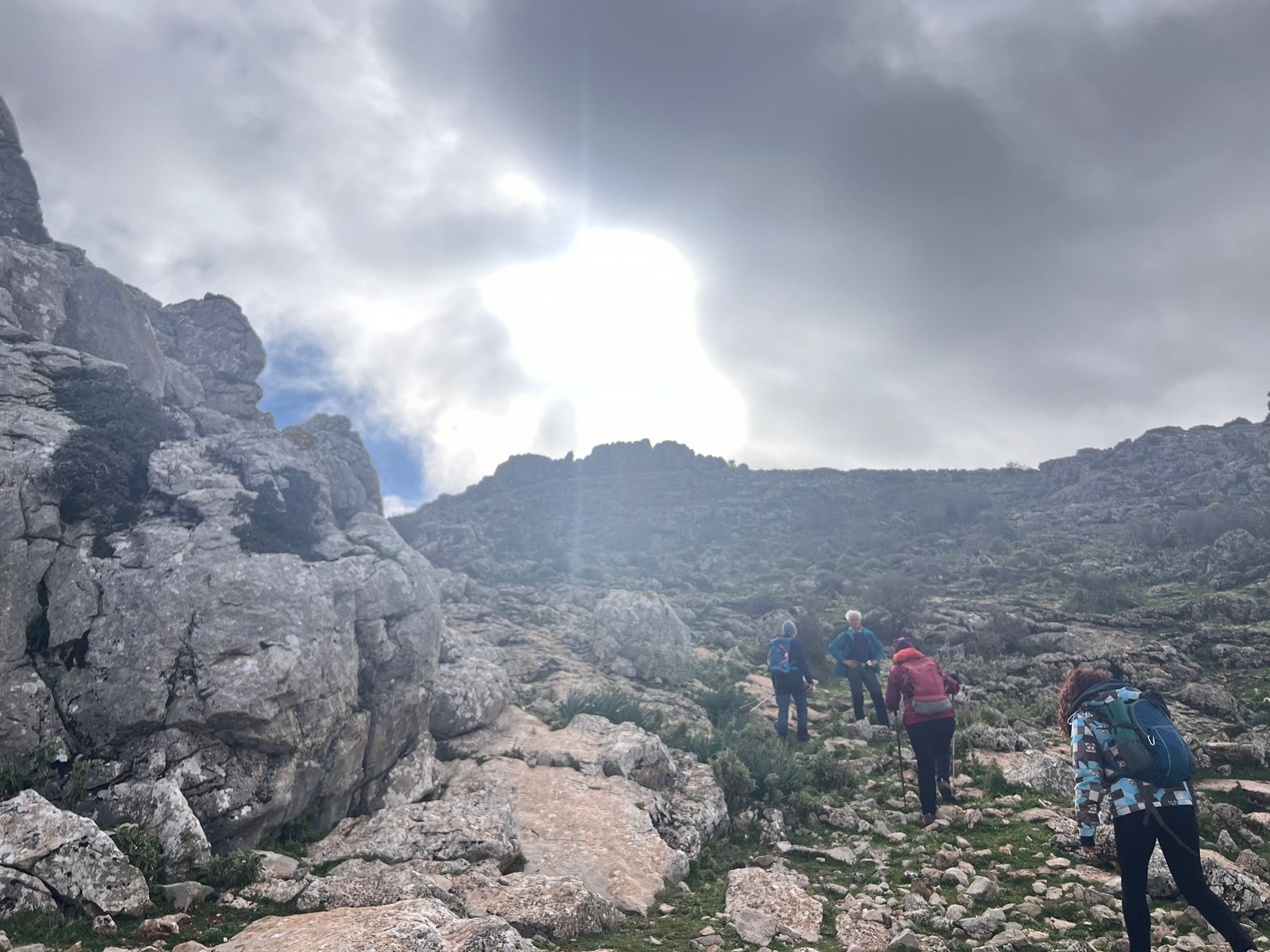 El cielo está muy nuboso, cubriendo casi todas las cumbres más altas a nuestro alrededor, incluyendo el Pico Blanquilla, también conocido como Pico del Viento, a 1.429 metros sobre el nivel del mar, que es el más alto de esta sierra y objetivo principal de nuestra ruta de hoy.
