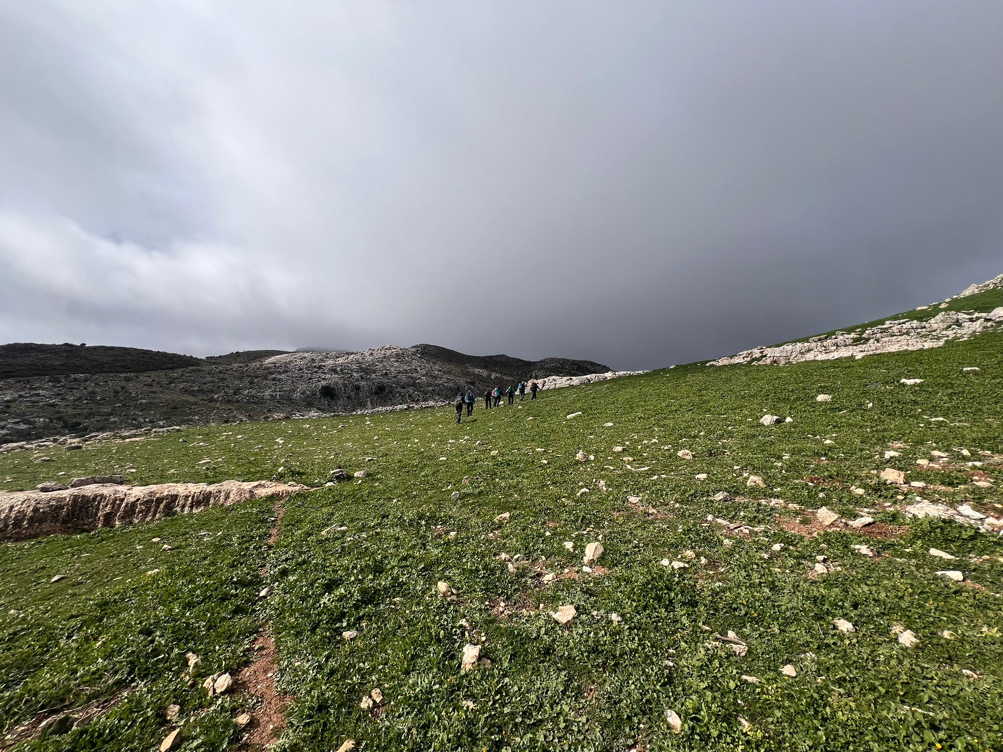 No deja de llover, y nada más comenzar a caminar, durante un par de minutos aproximadamente, la lluvia se transforma en diminutos granizos, para poco a poco ir desapareciendo. Al cabo de un kilómetro y medio aproximadamente, por fin cesa la lluvia, y aprovechando tal circunstancia, al pasar por una zona protegida del viento, poco antes de llegar a un pequeño “torcalillo” próximo al Arroyo del Manantial del Soldado, decidimos hacer una breve parada para comer algo antes de acabar la ruta, lo cual hicimos de pie y muy fugazmente.