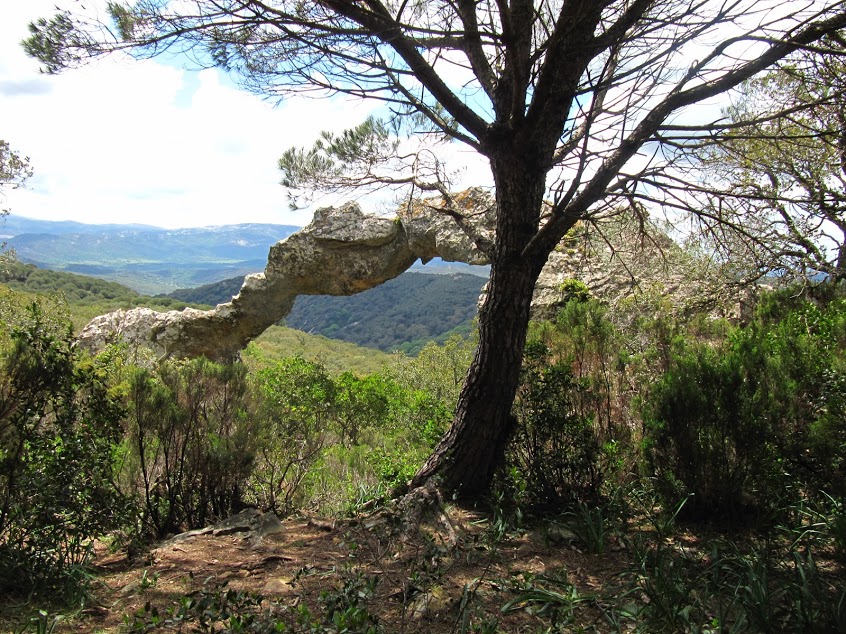 Merece especial atención desviarse para contemplar “Piedra Orá”, un curioso arco de piedra arenisca labrado por la erosión, que emerge en este bosque mediterráneo.