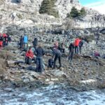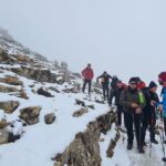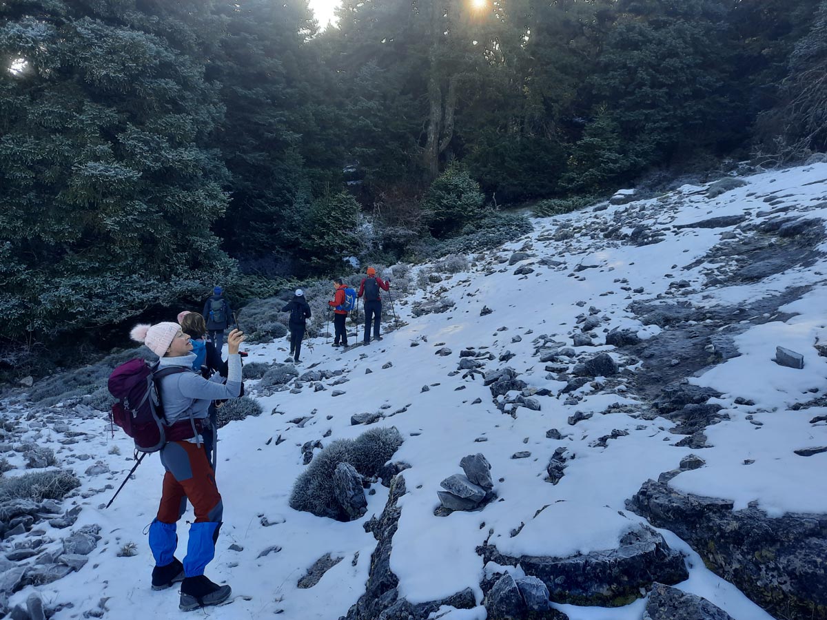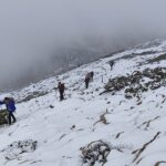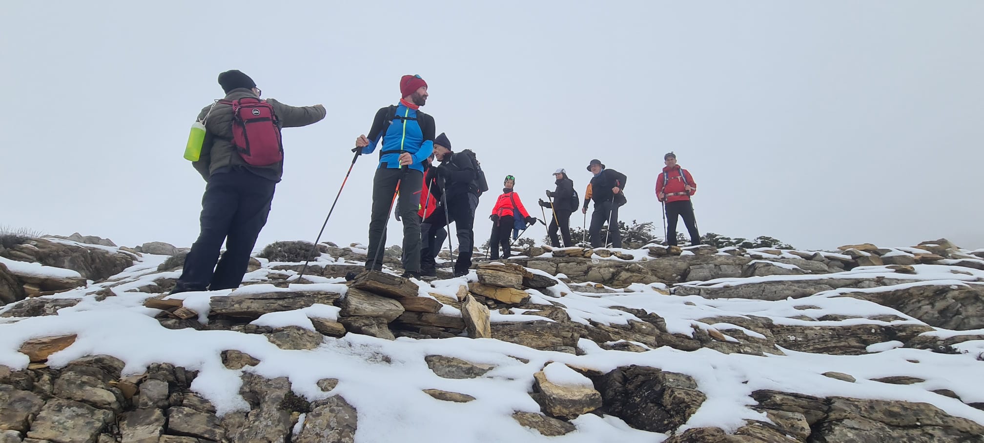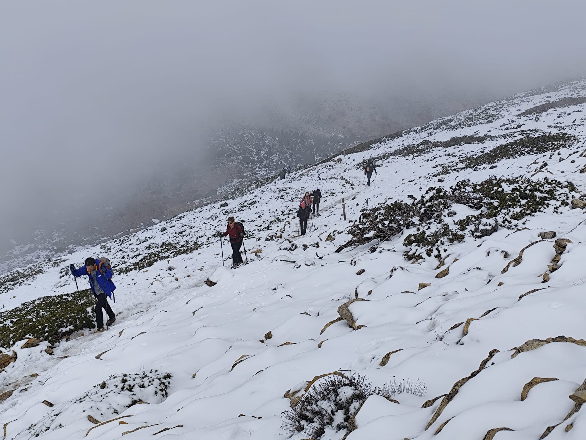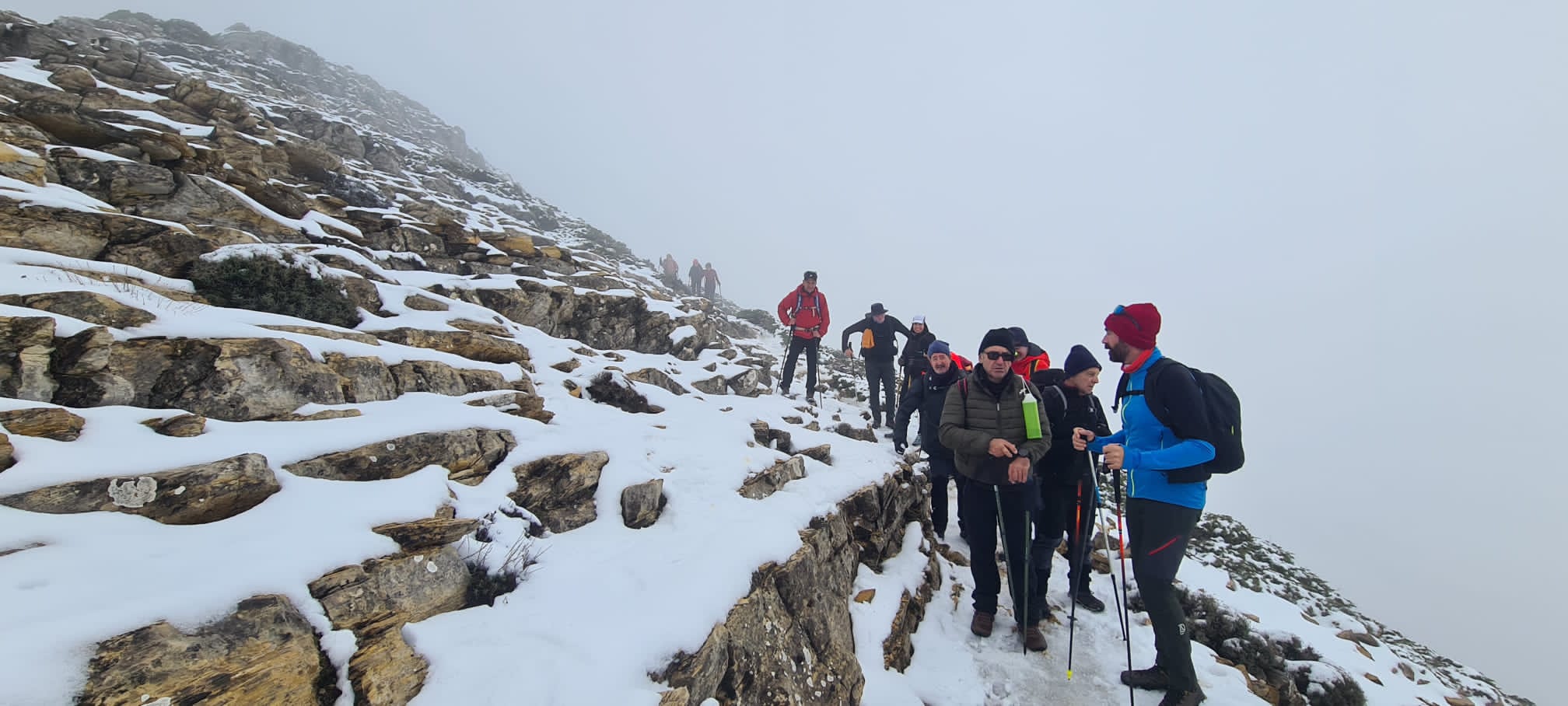 Decidimos iniciar la subida a ver como nos encontramos el suelo. Al poco de iniciar el ascenso, 6 compañeros decidimos dar por concluida la subida, dada la presencia de placas de hielo, y temiendo la dificultad de la bajada. El resto del grupo decide seguir.