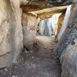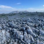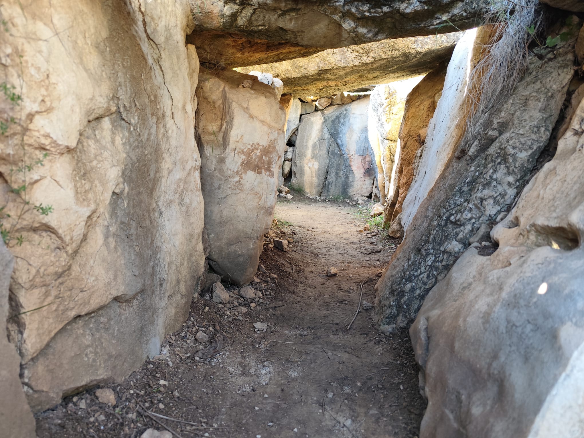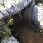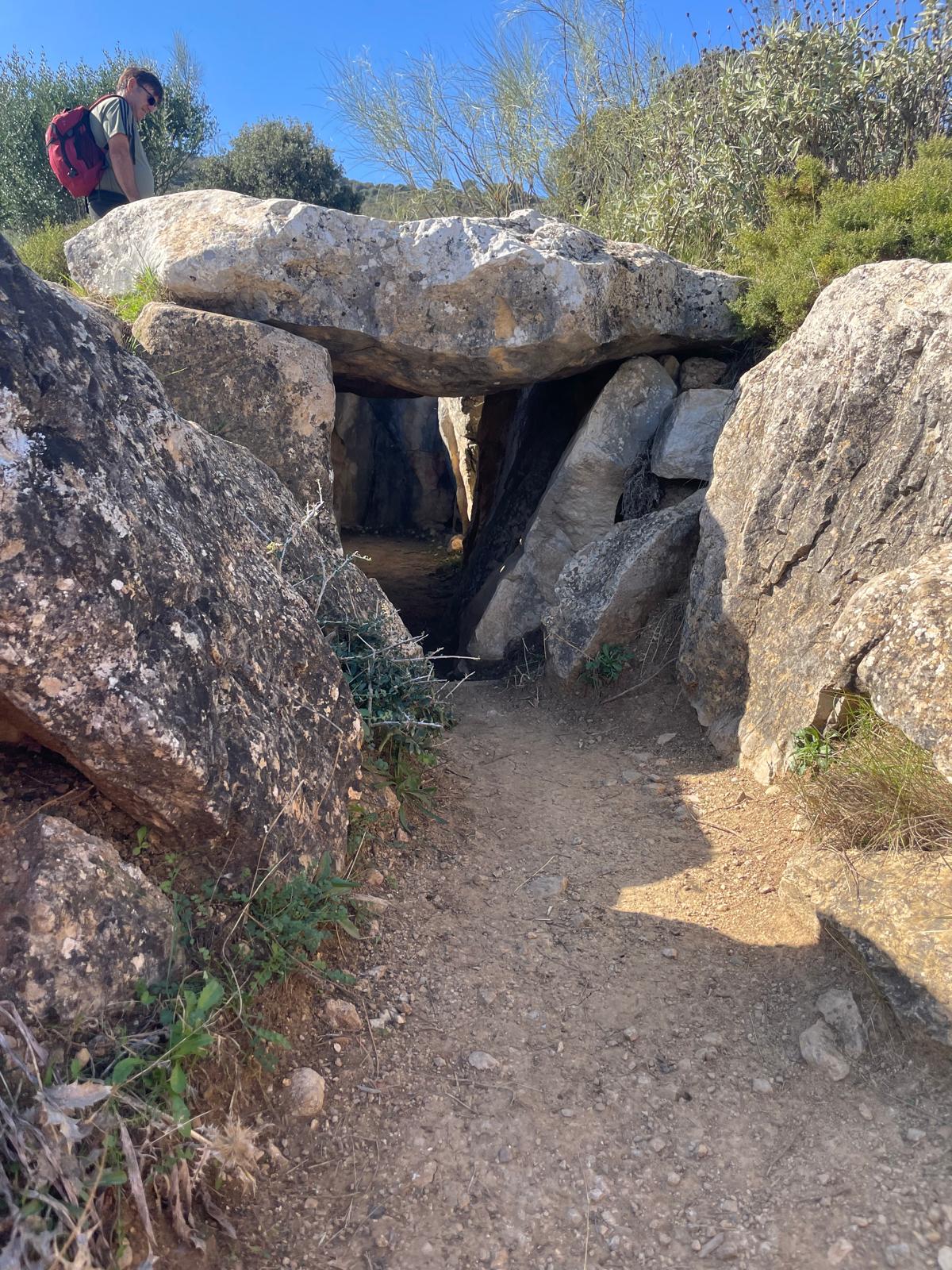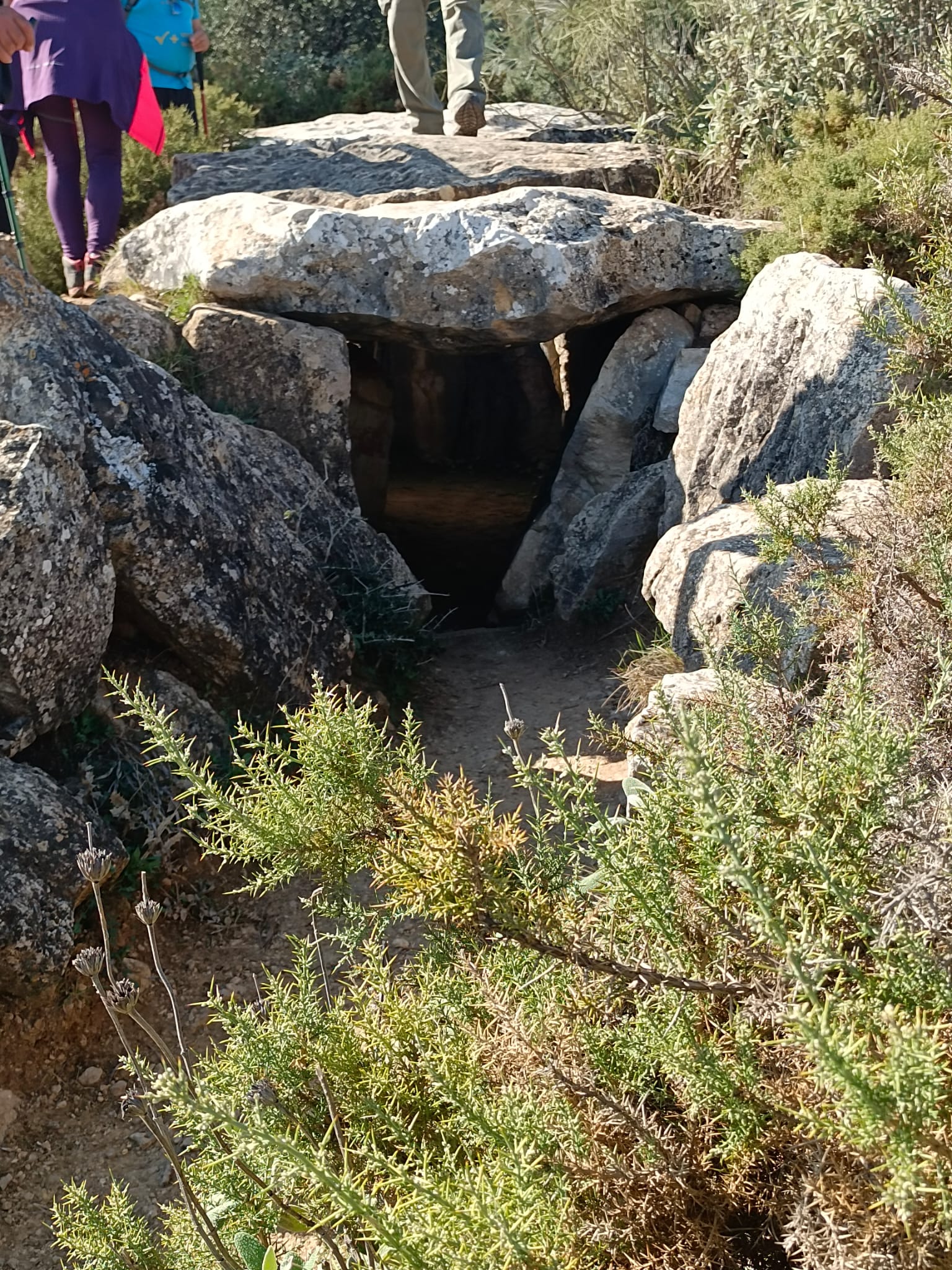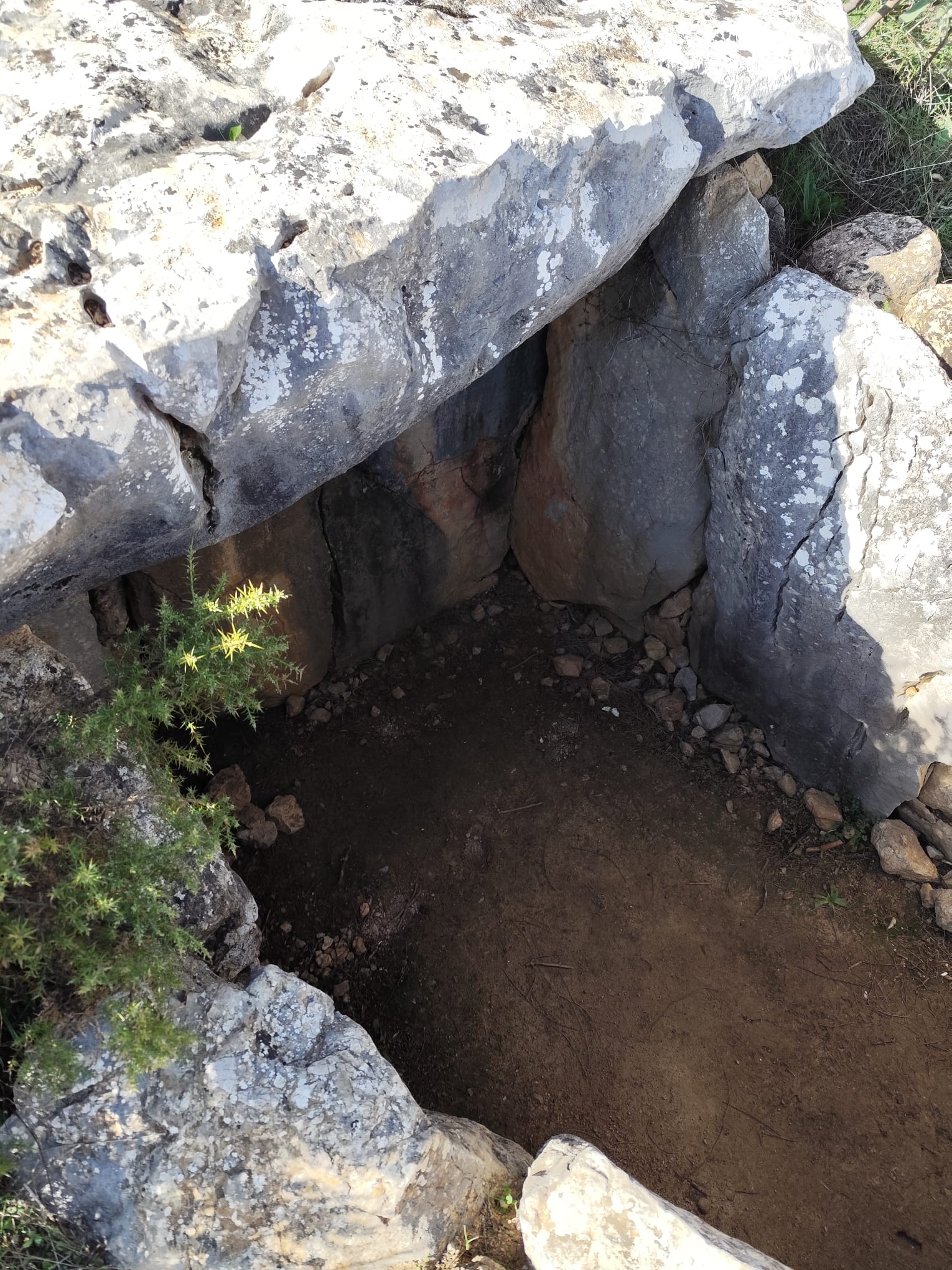 Cruzamos nuevamente la meseta de lapiaces, ahora en sentido descendente, para volver a la bifurcación del collado entre los dos picos. Allí tomamos el desvío a nuestra derecha y seguimos bajando en dirección Este hacia el Dolmen del Gigante, siguiendo escrupulosamente el track, pues el camino que llevamos se cruza en más de una ocasión con varios senderos sin señalizar, y uno que vemos señalizado, se presta a una duda más que razonable teniendo en cuenta la dirección que indica y la ubicación del Dolmen.
