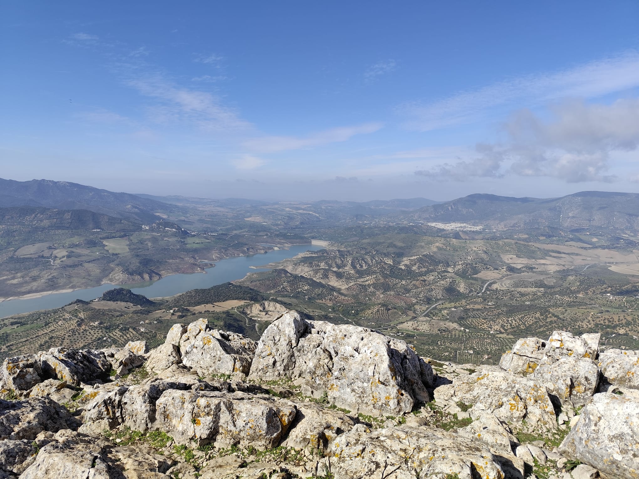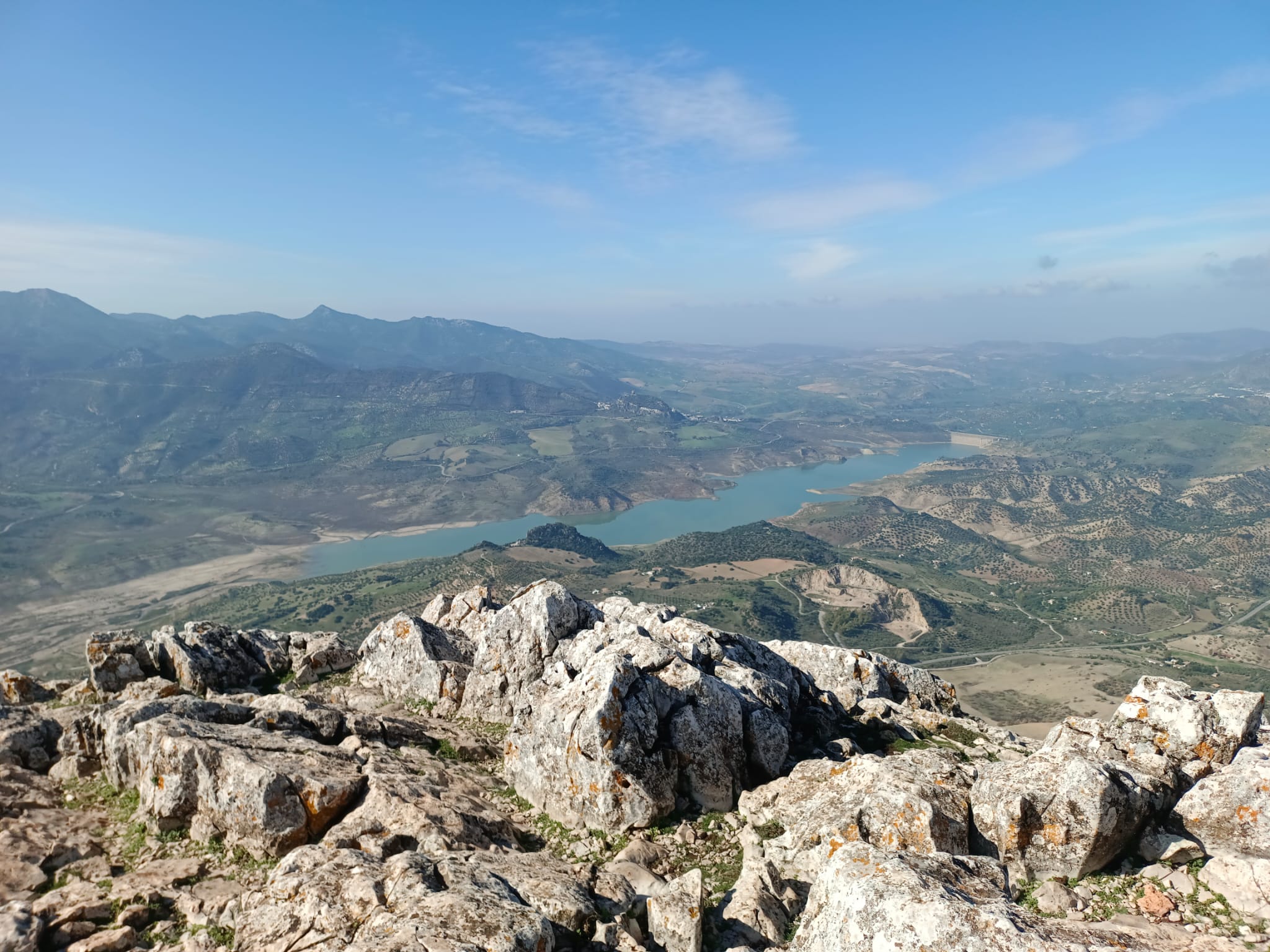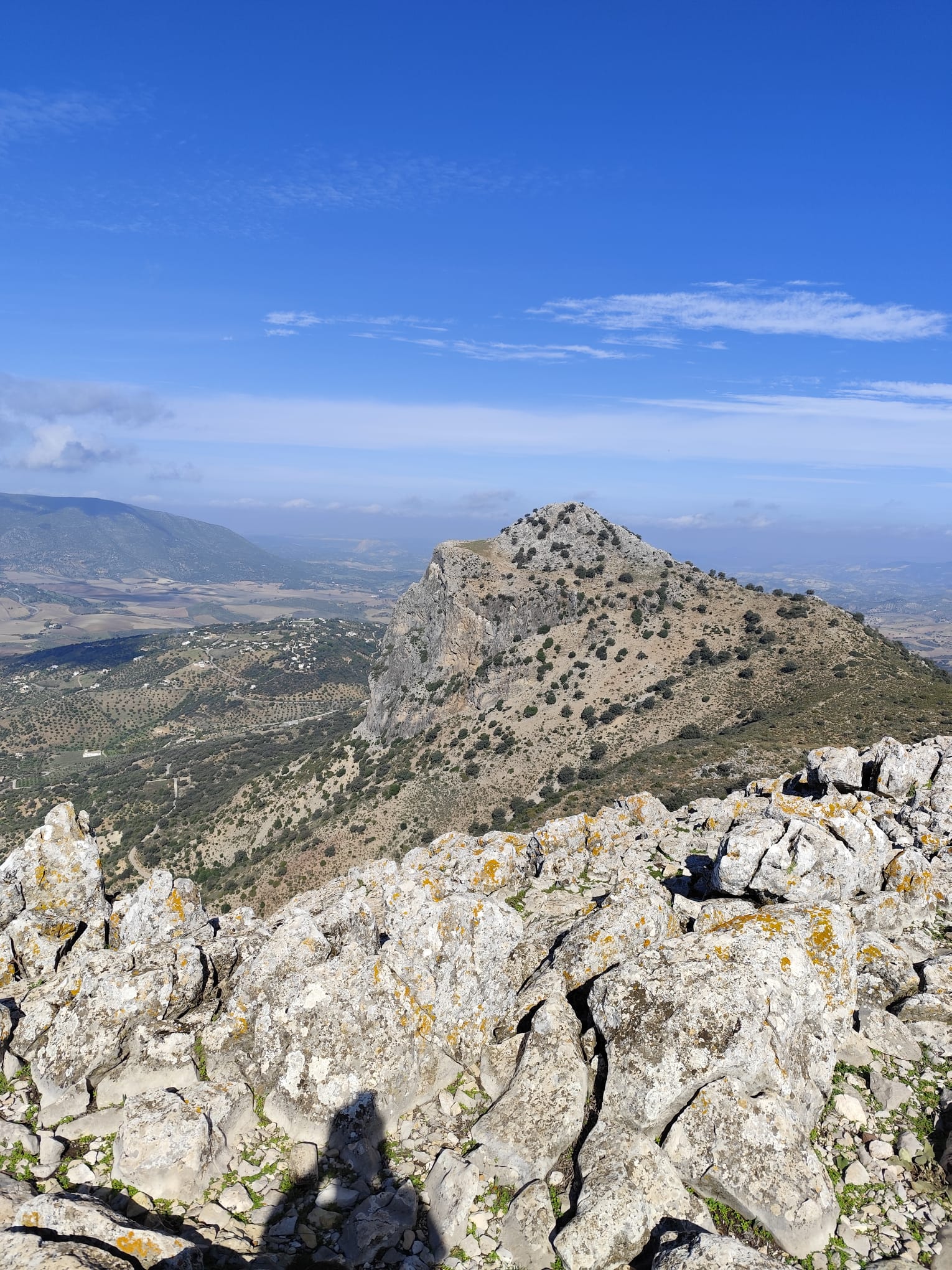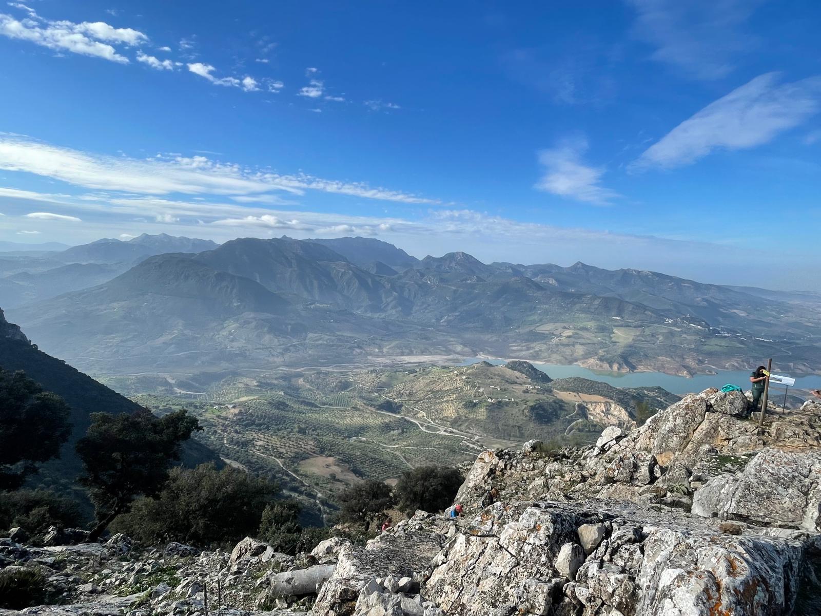 Alcanzamos su cima sobre las 12:20 horas. Su impresionante explanada, que cae en paredes verticales, nos ofrece en 360º casi las mismas vistas que teníamos desde el Pico Algarín, aunque desde otra perspectiva, y excelentes panorámicas de Montecorto, el Cerro Malaver y Ronda, entre otras, destacando la presencia constante de buitres leonados, cuyo vuelo venimos observando desde entonces.