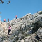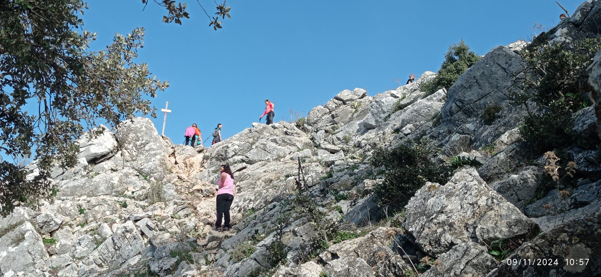 Estamos a 1.015 msnm, y tenemos que ganar otros 52 metros de altura, a través de un terreno muy irregular en los 100 metros que nos separan de la cima. Aquí dejamos nuestras mochilas, al cuidado de un compañero, y afrontamos el último tramo de ascensión al Tajo Algarín (1.067 msnm), haciendo cumbre sobre las 11:05 horas.