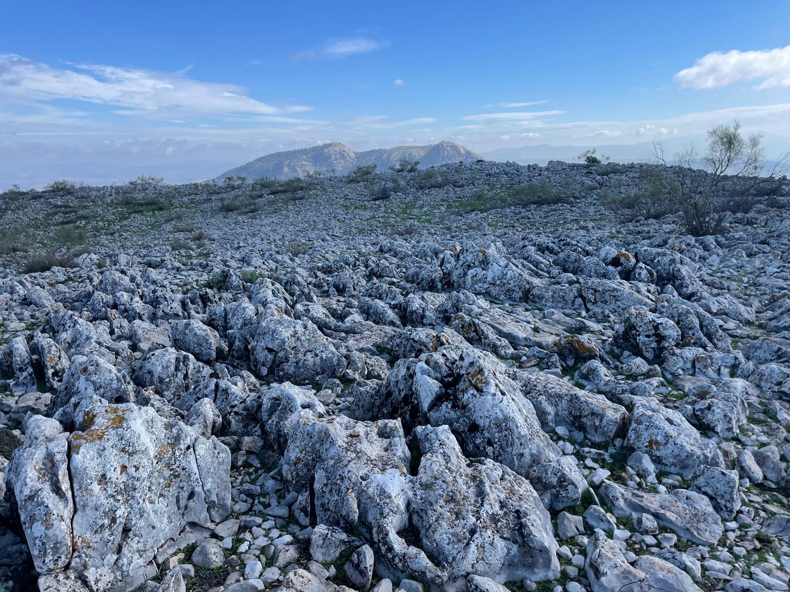 Caminamos en paralelo a una alambrada a nuestra izquierda, la cual, según OpenStreetMap, limita la Sierra de Cádiz con la Serranía de Ronda. Cruzamos dicha alambrada por un saltadero, y entramos en una antiplanicie kárstica que tenemos que atravesar monte a través hacia el SO, para llegar hasta nuestro segundo objetivo, coronar la Cima Las Grajas (1.041 msnm), que es la tercera montaña más alta que rodea el municipio de El Gastor.